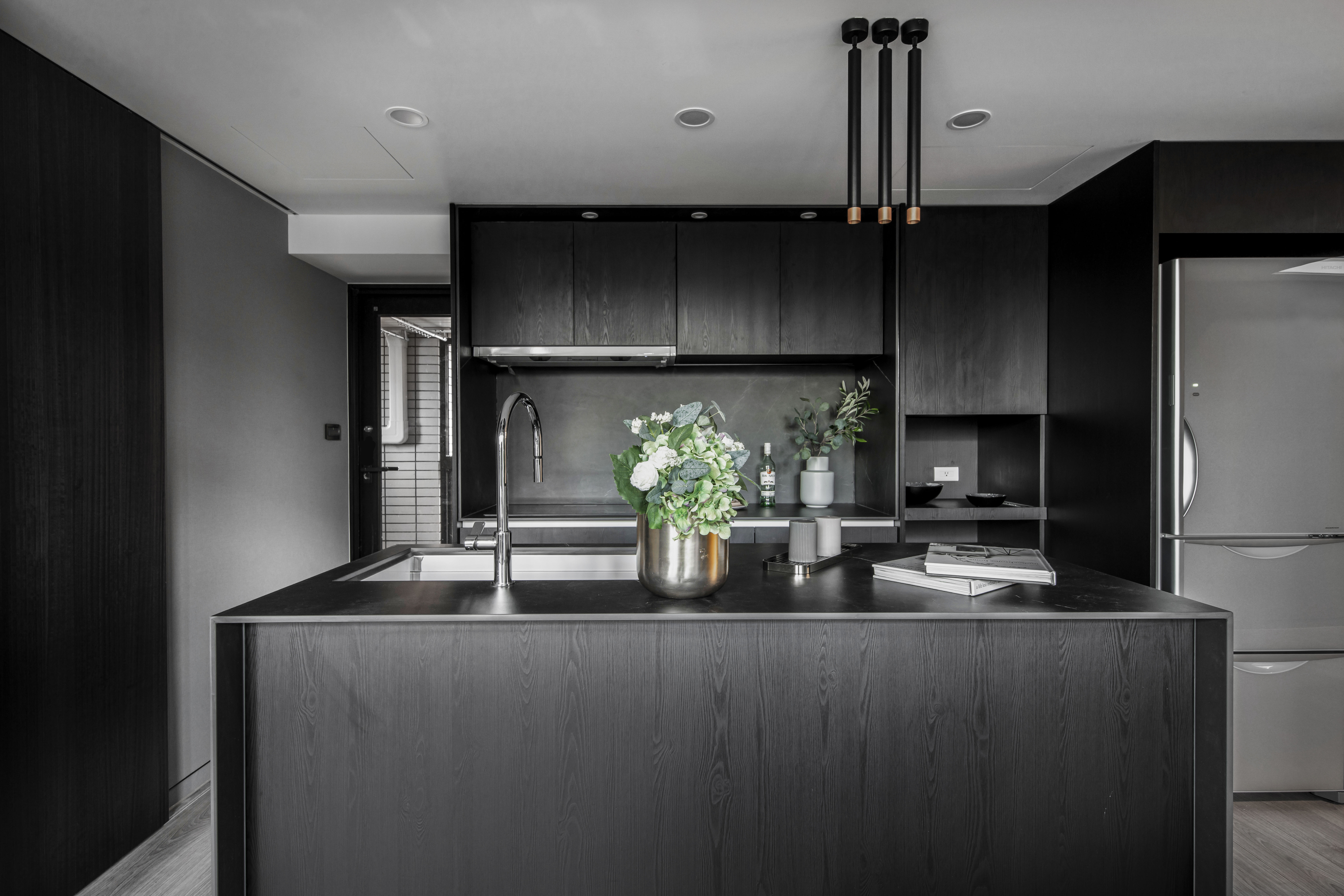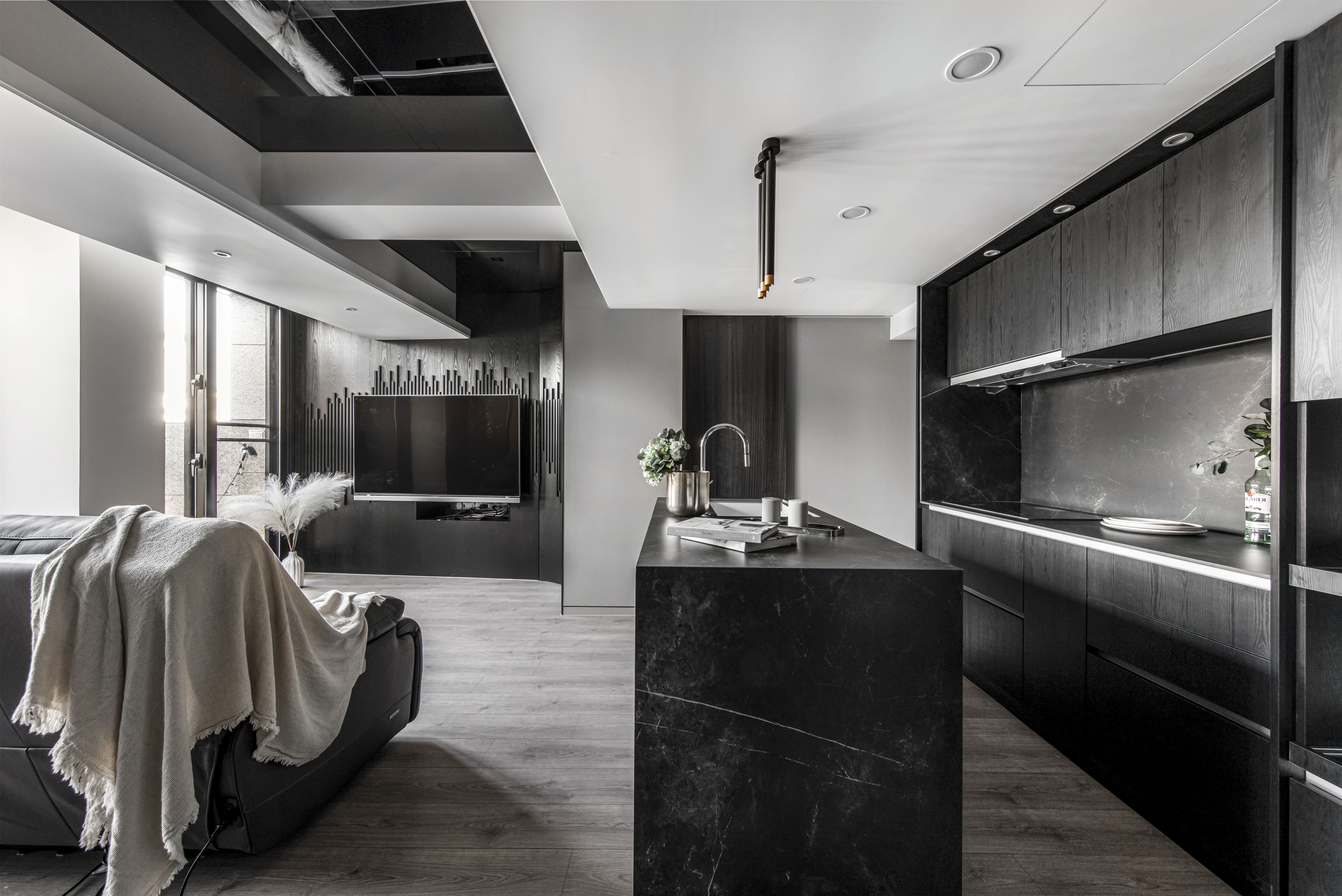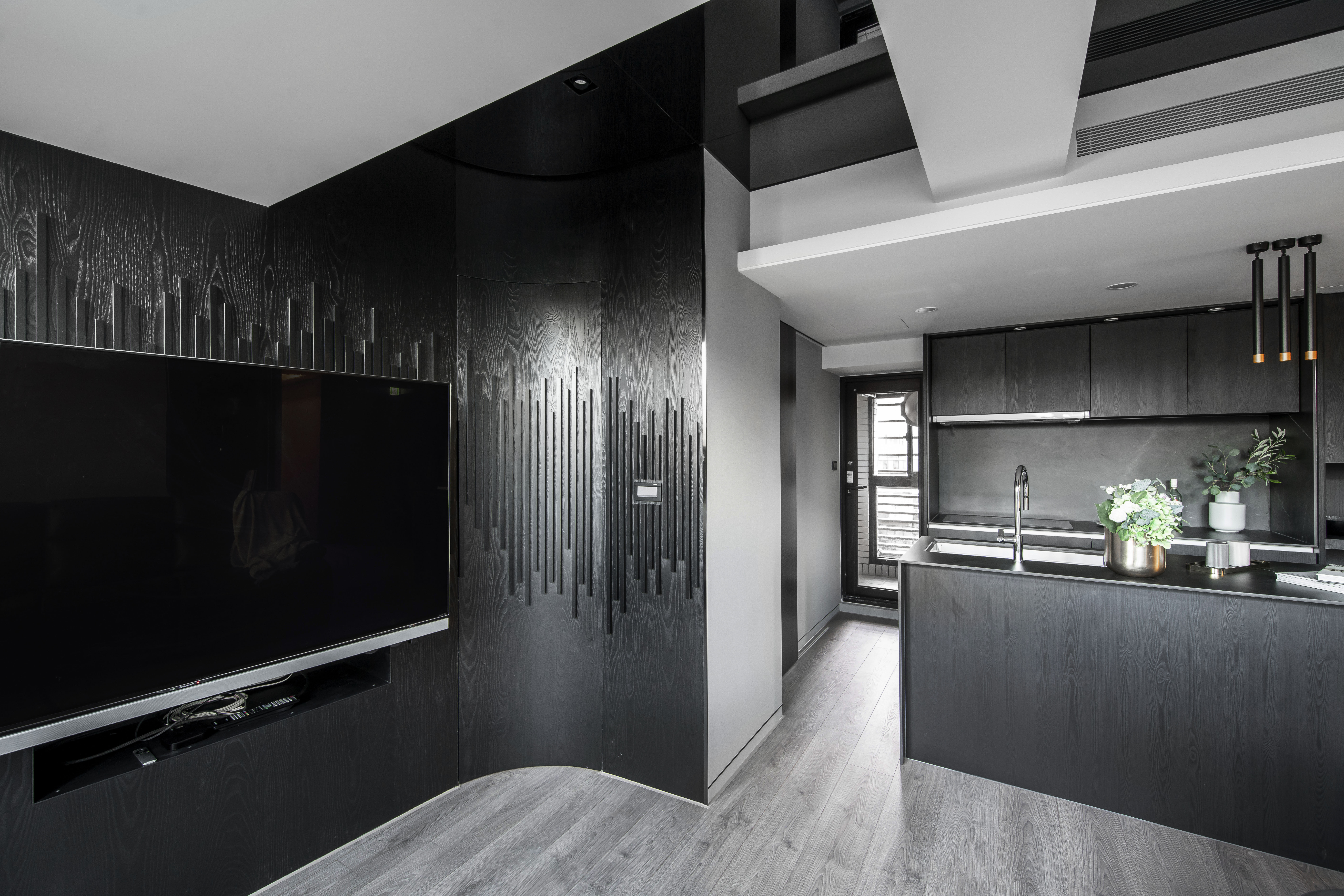 空間中的概念承襲藝術家本身對於創作的本質與之延伸,在每一光線的落腳處,運用黑色基底與彼此間的重疊、交錯,讓光能在每一處的設計與裝潢間來回流動,在深黑色線條的肌理中透出光芒,形塑成一種有力的結構,進而衍生出空間裡黑色與光相互存在的律動感。