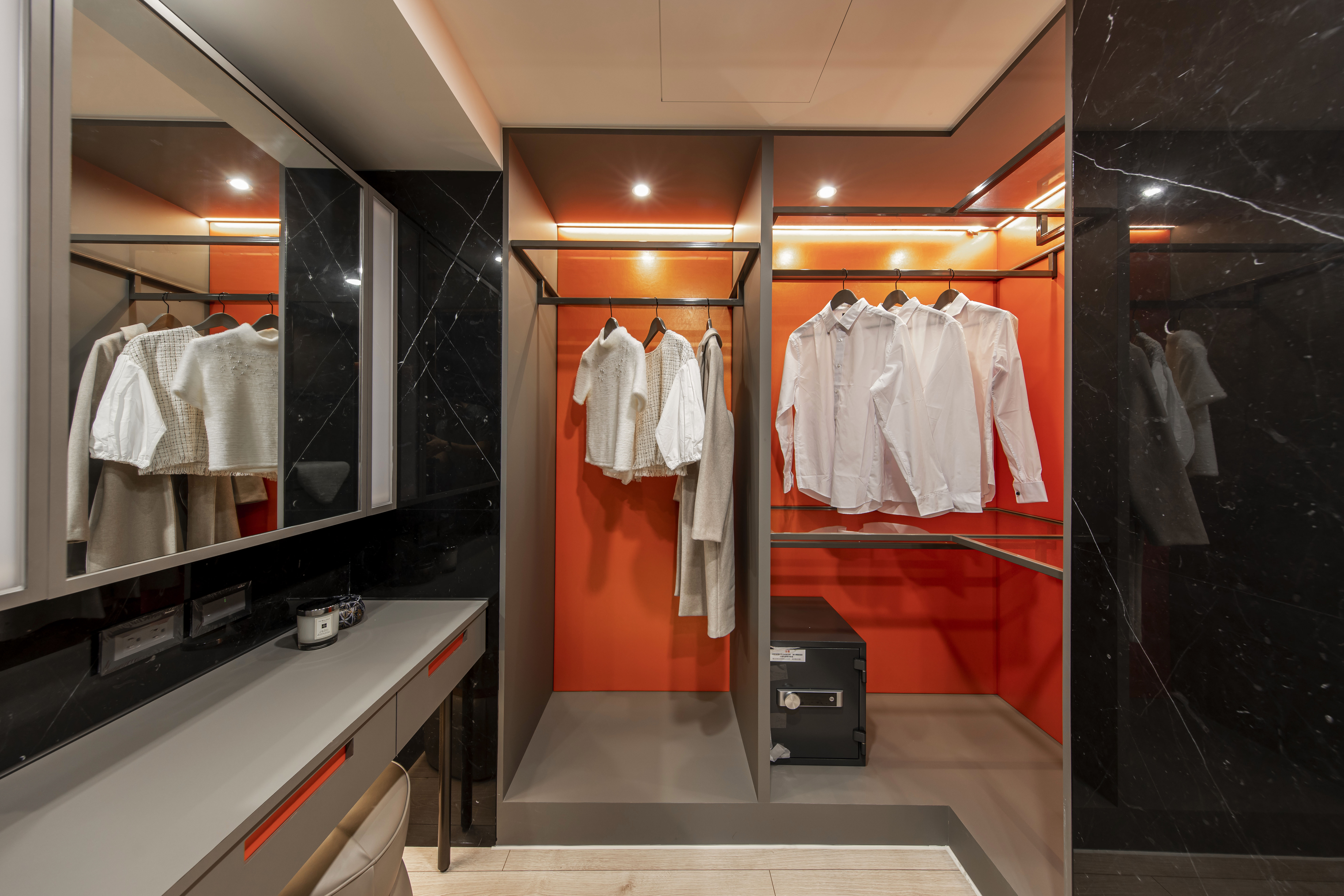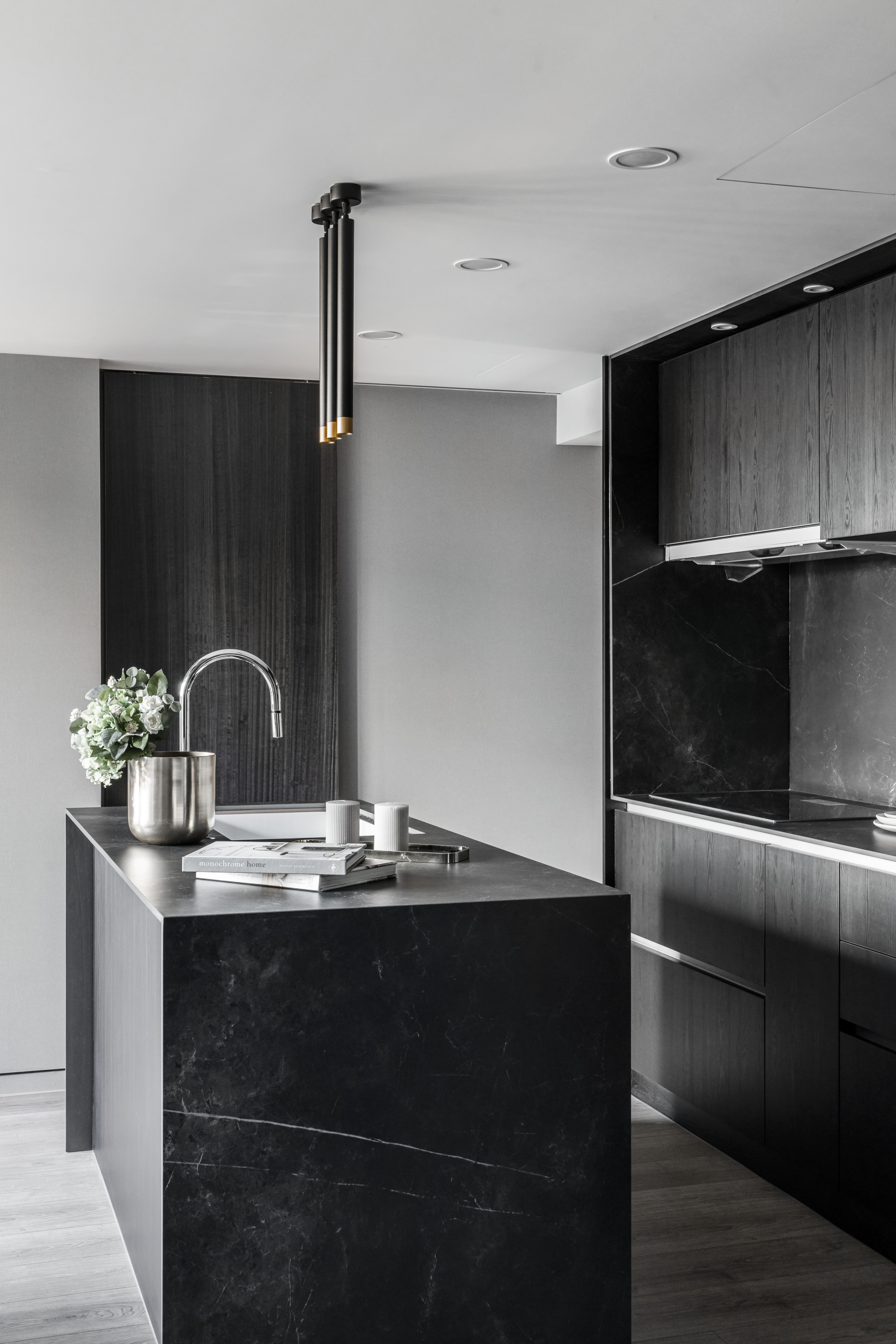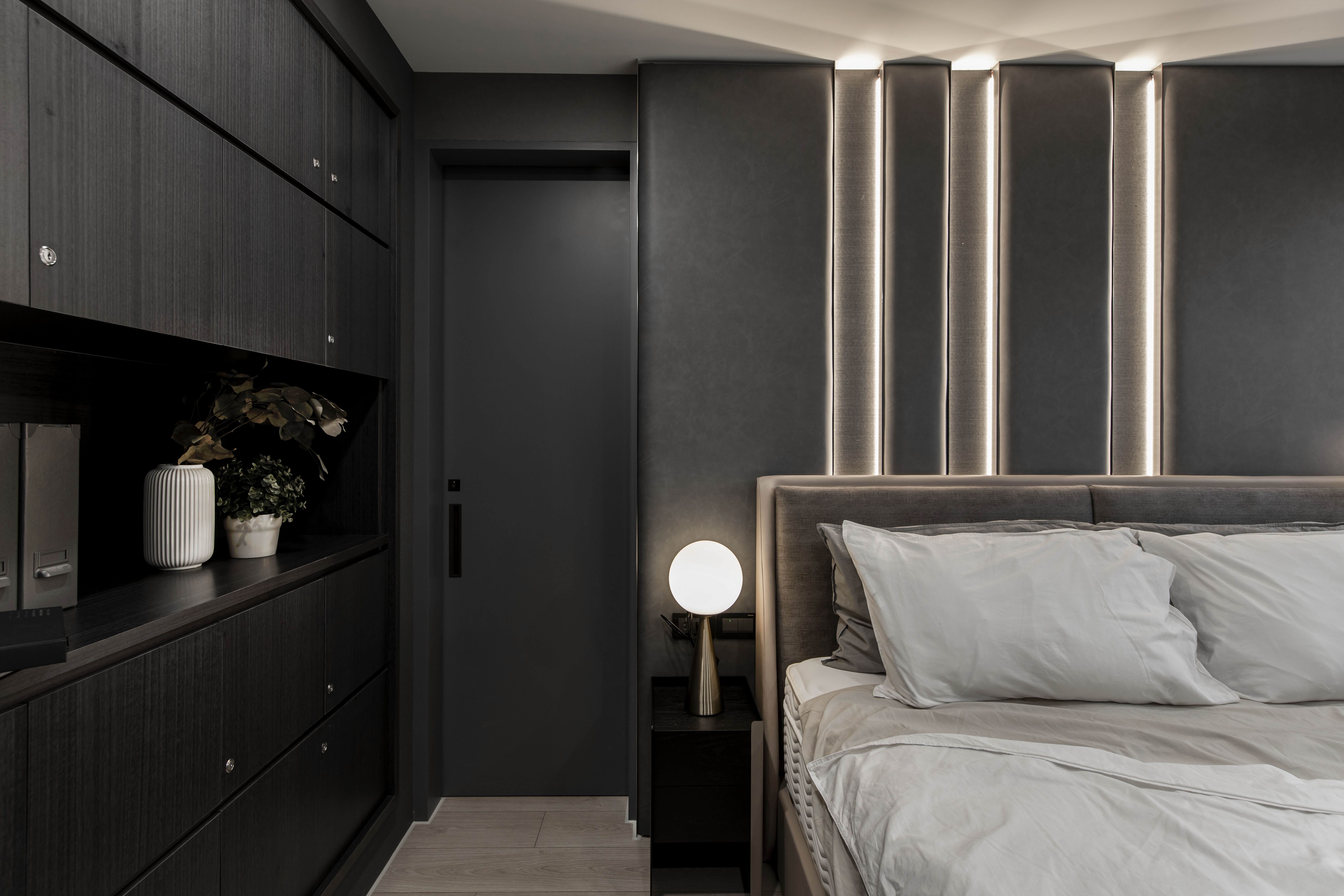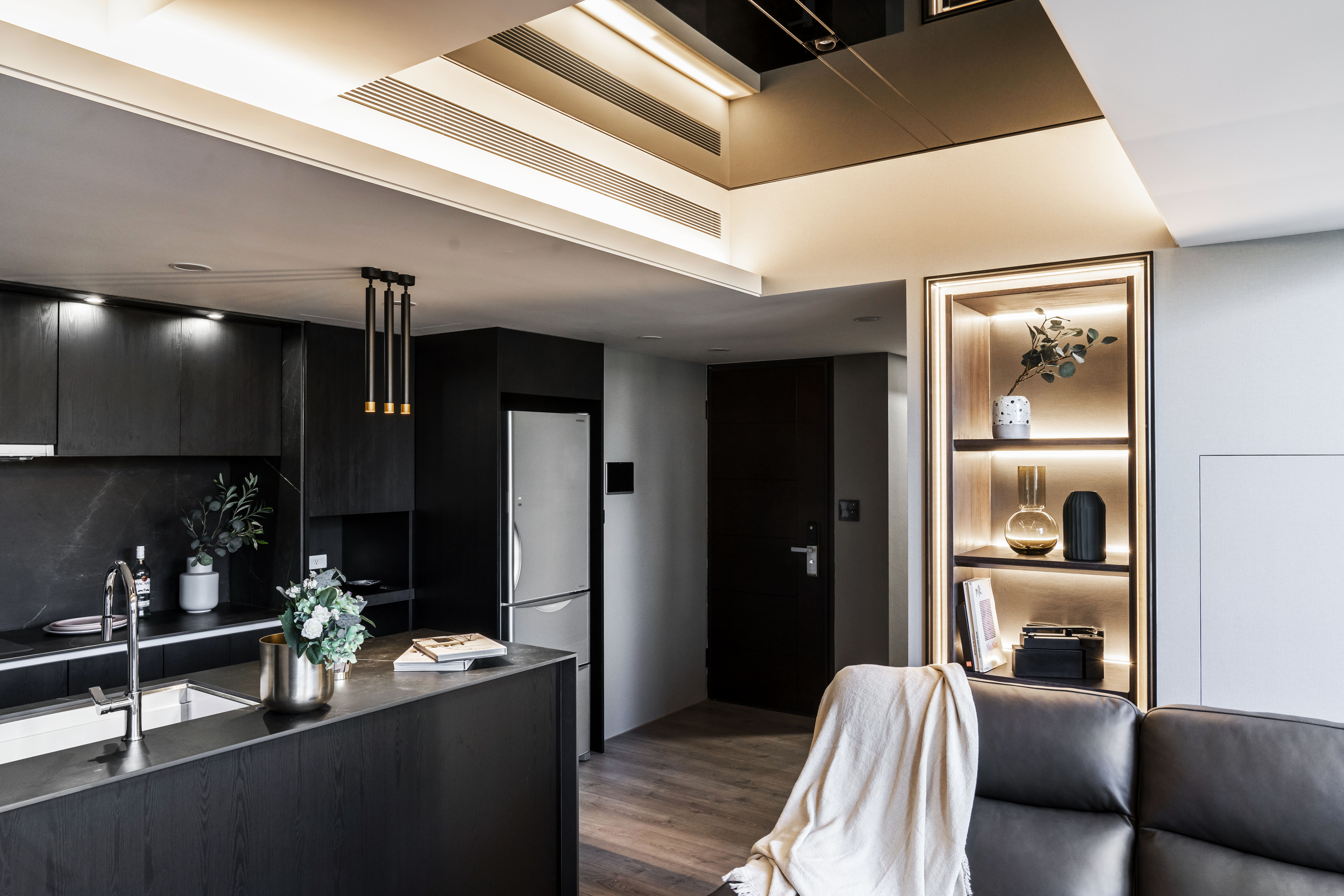 空間中的概念承襲藝術家本身對於創作的本質與之延伸,在每一光線的落腳處,運用黑色基底與彼此間的重疊、交錯,讓光能在每一處的設計與裝潢間來回流動,在深黑色線條的肌理中透出光芒,形塑成一種有力的結構,進而衍生出空間裡黑色與光相互存在的律動感。