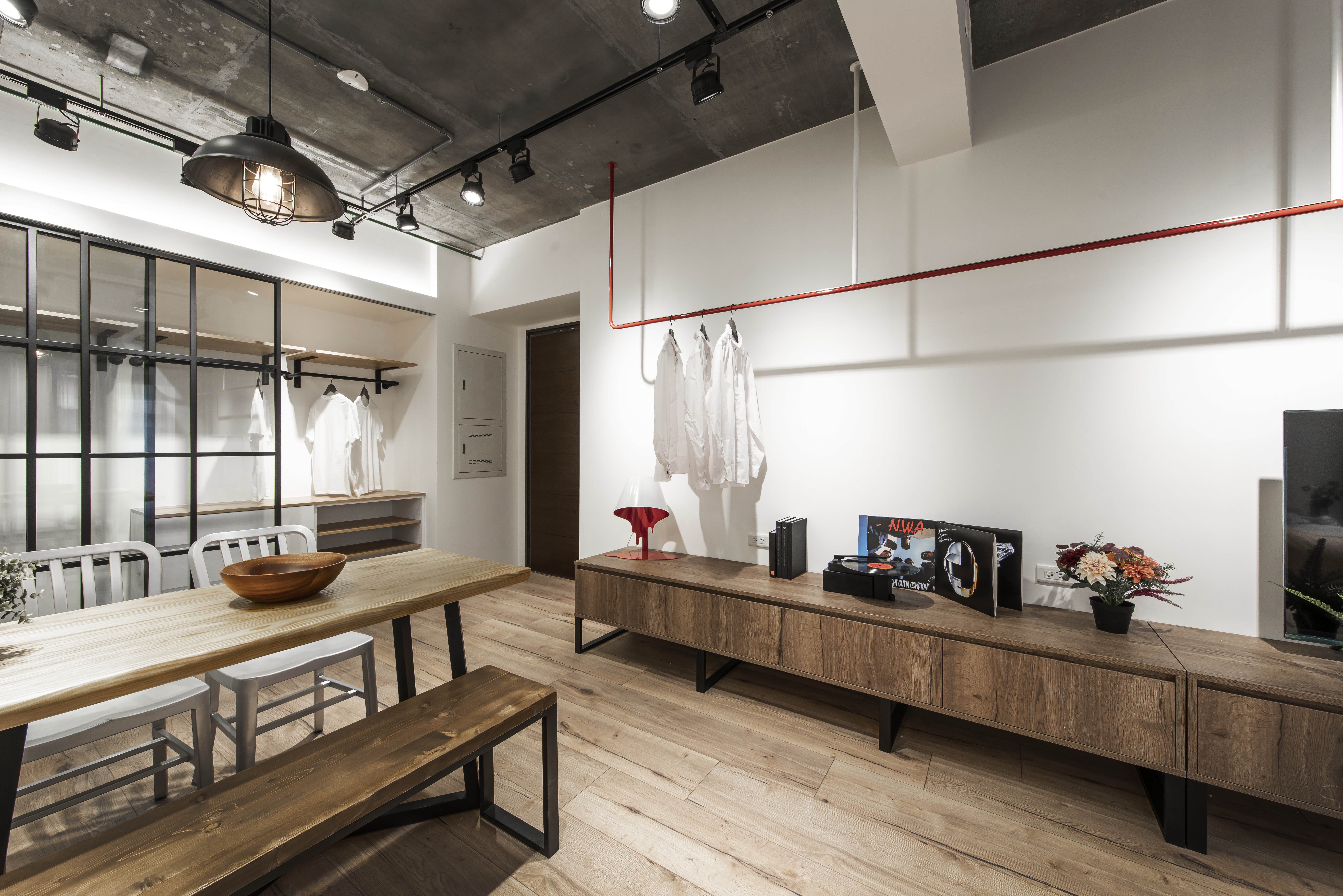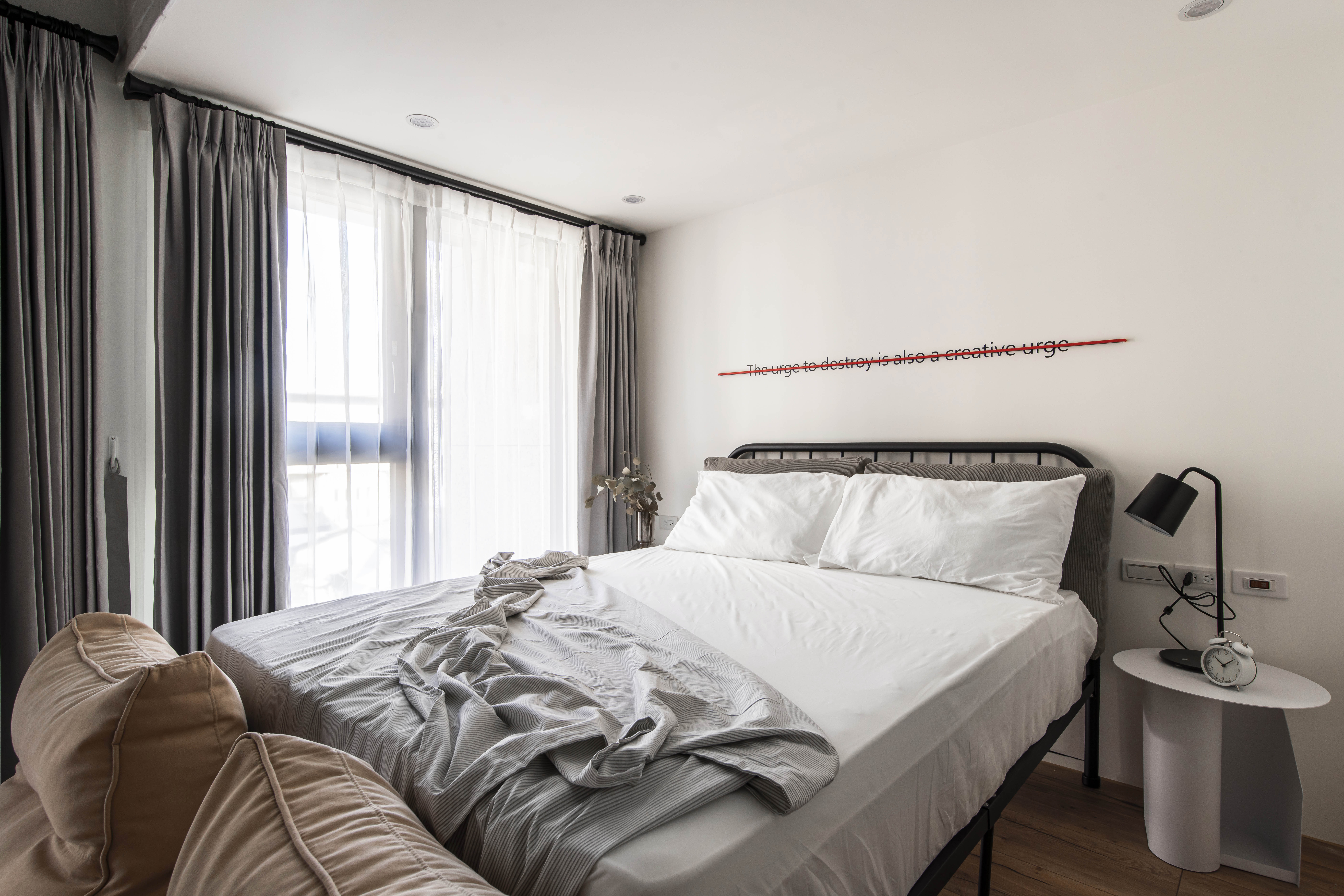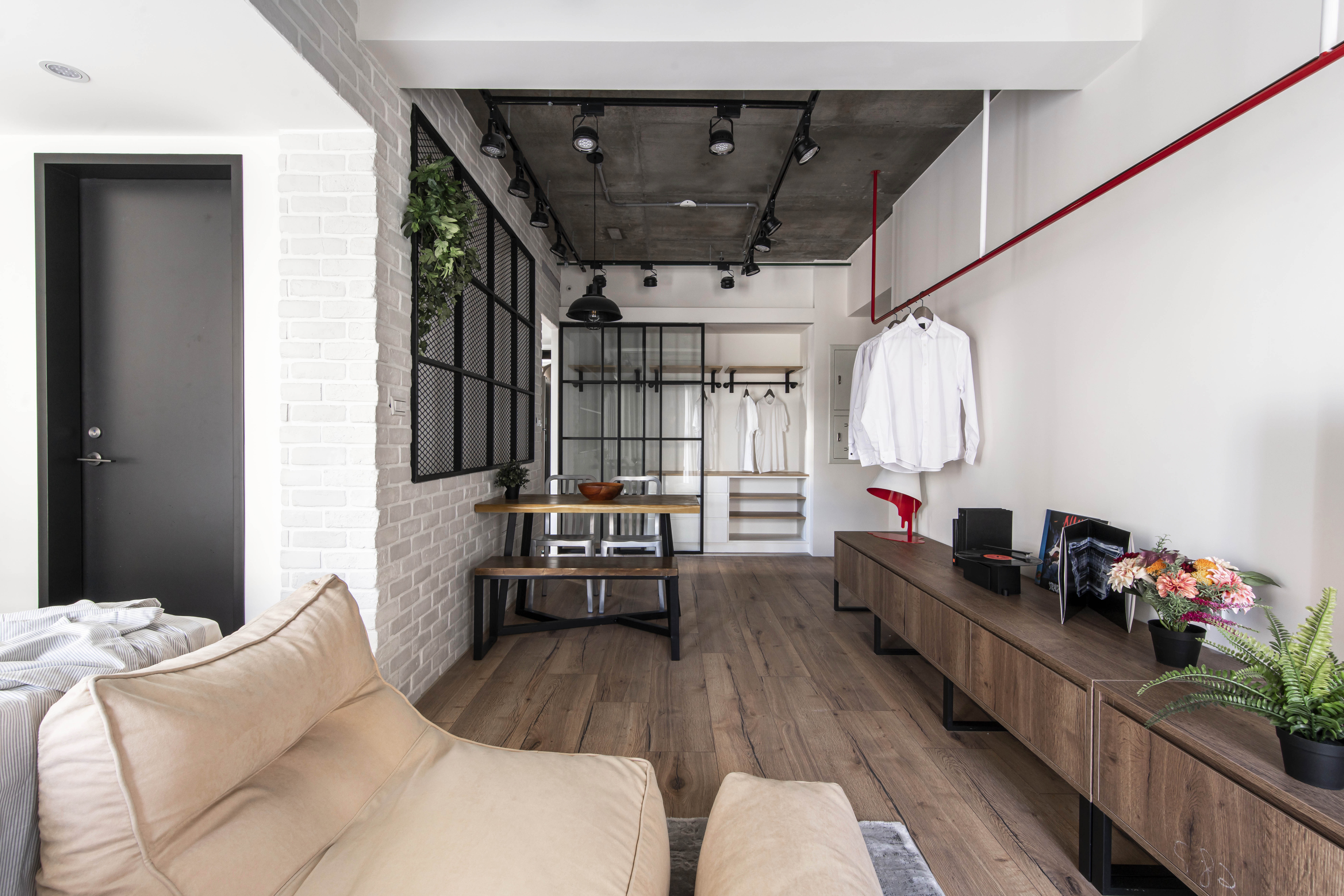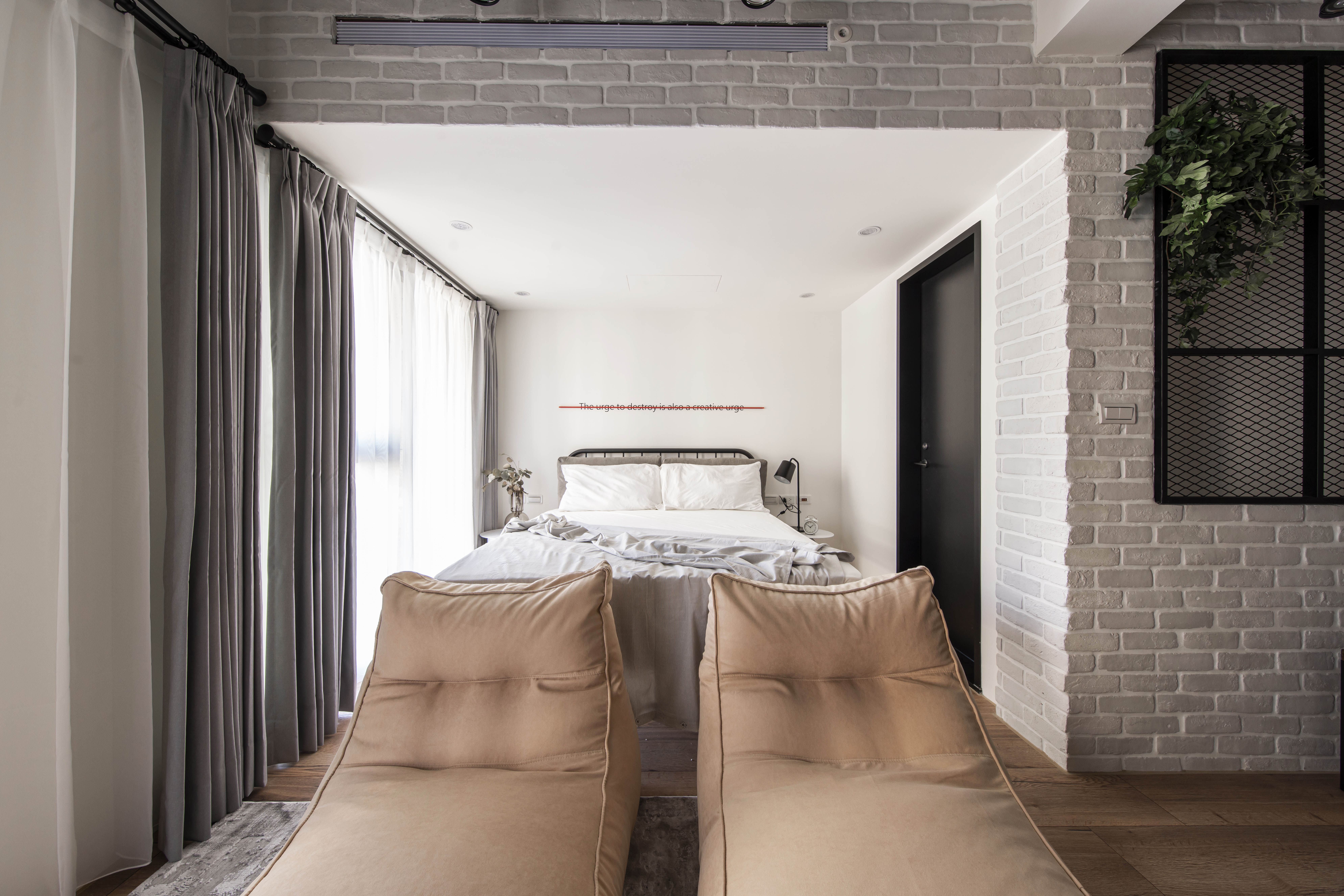 空間的元素以Banksy作畫的街頭出發點,運用著溫潤的根本和堅毅的造型,加入工業風並予以混和出一種新的輪廓,投入些許色彩增添趣味性,搭配幽默的文字帶出藝術家本身的詼諧創意,建構出別具意義的休憩環境