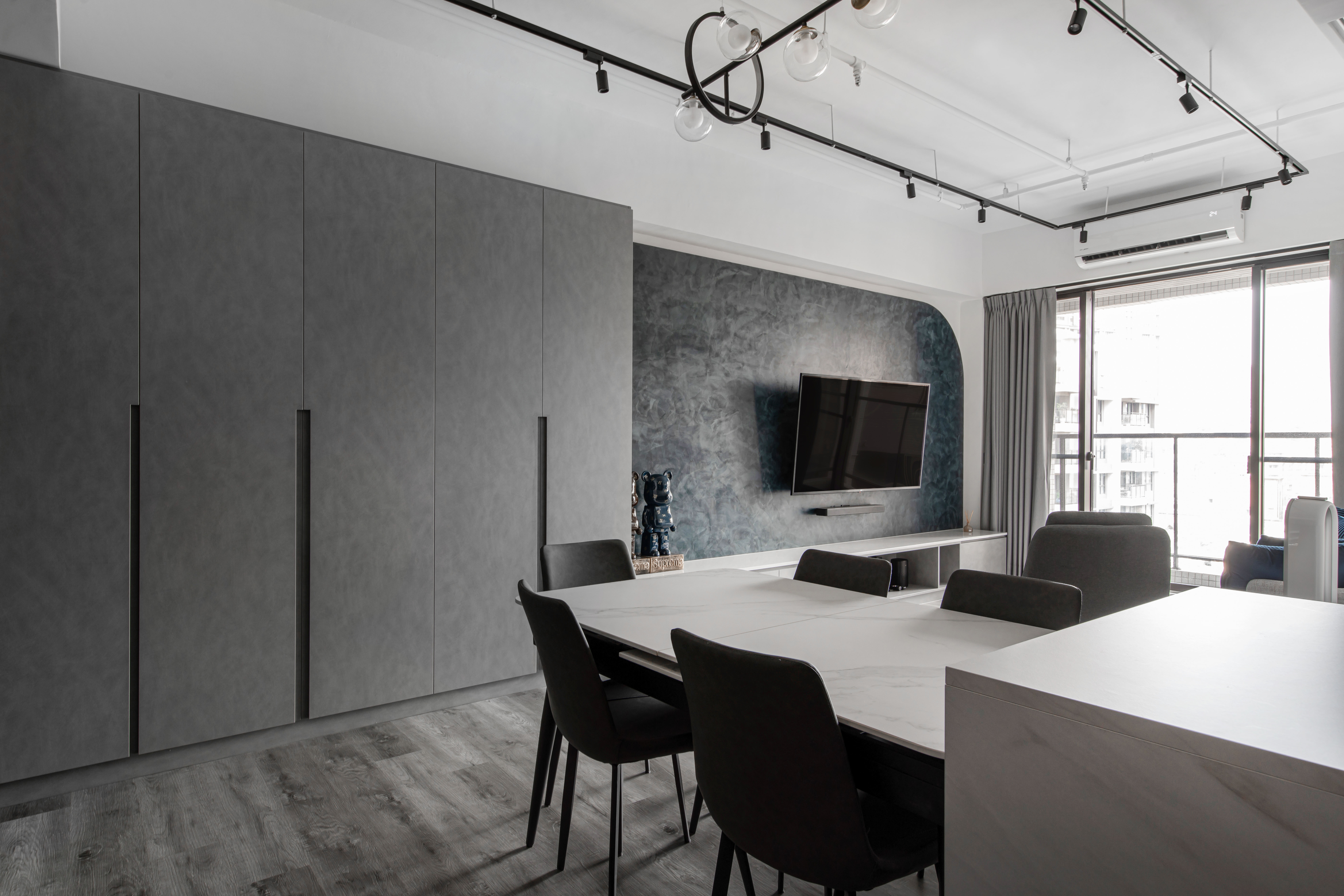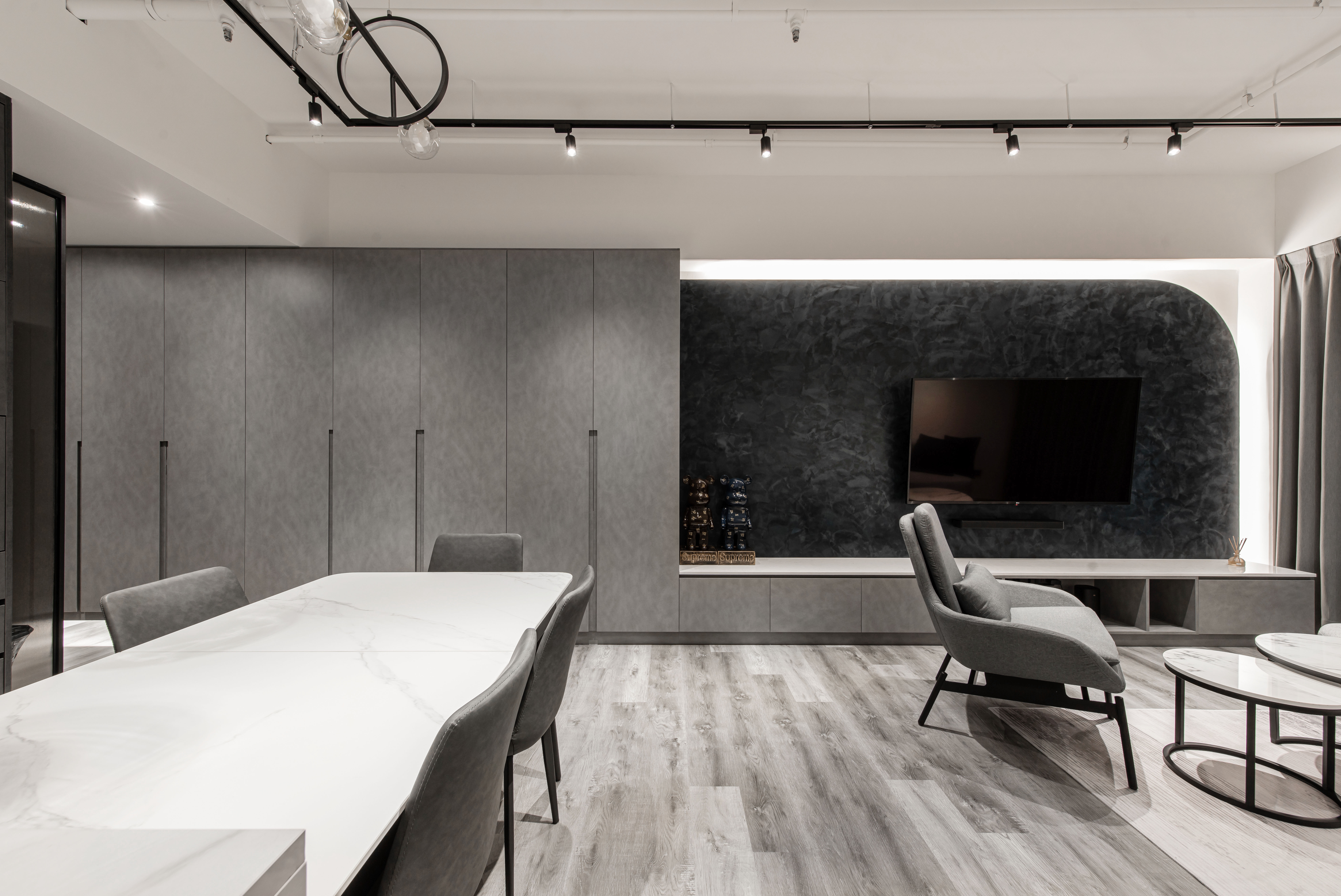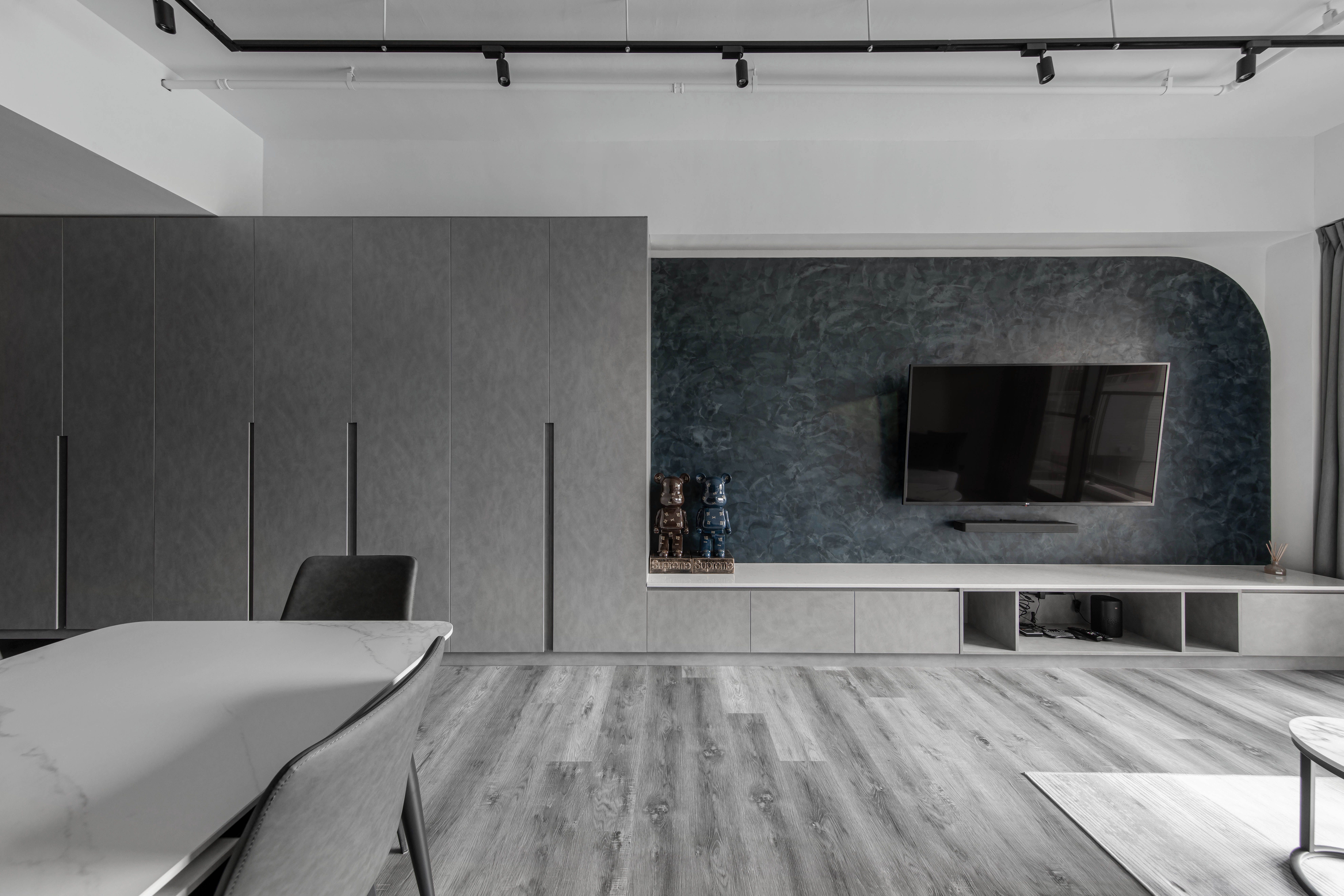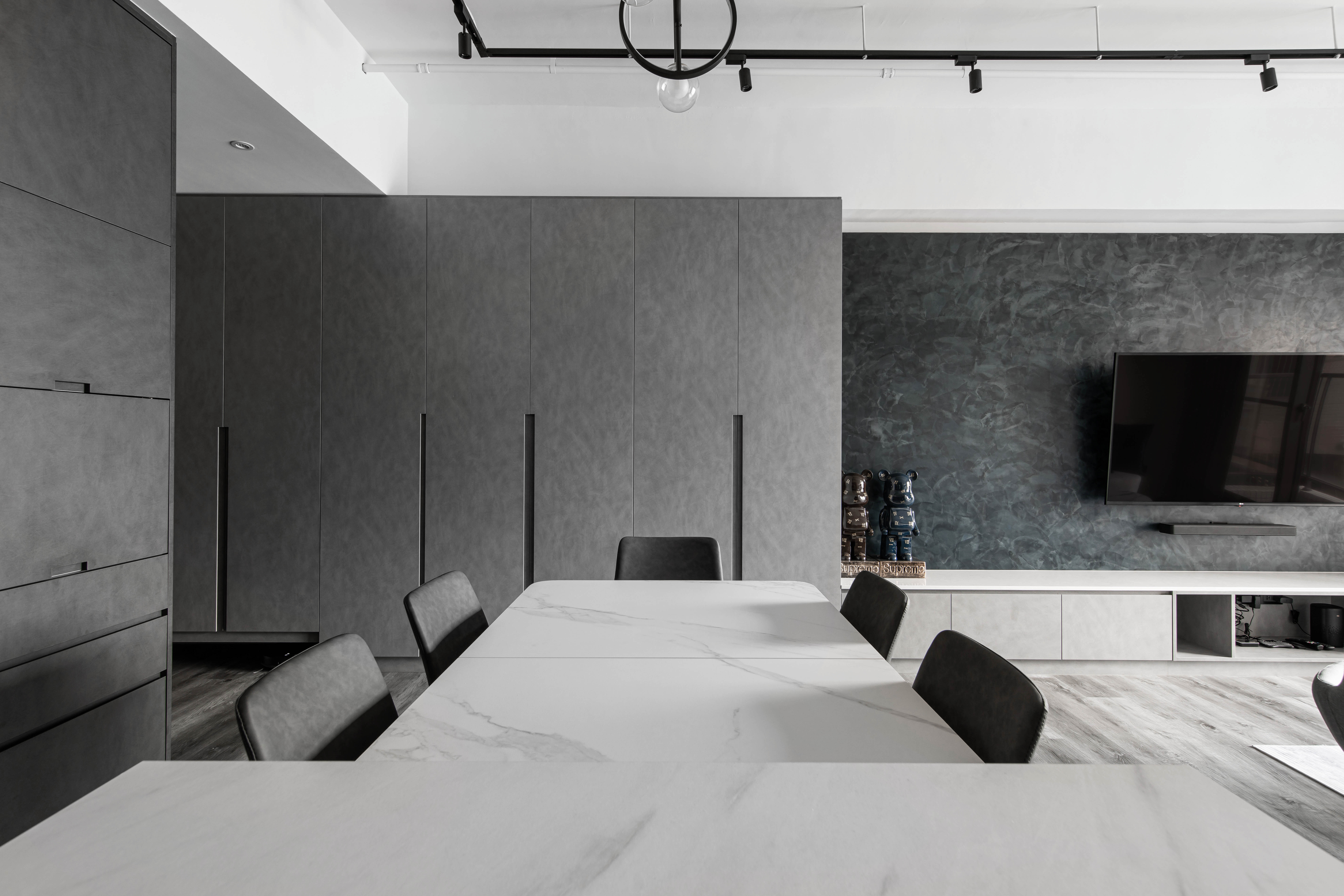 本案空間大量採用經典的灰與白鋪敘,透由家具、軟件添上不同色階黑、白、灰筆觸,營造中深遂、立體且延續的空間感。從玄關延伸至電視櫃的收納量體,在此以單一色調俐落面貌裡,讓櫃體延伸了空間的視覺體現,深刻為裝潢風格定調,量身訂製的美型櫃體設計,不僅不會產生壓迫感,也充分創造出日後生活雜物的收納空間,在業主入住後,更容易維持環境整潔。