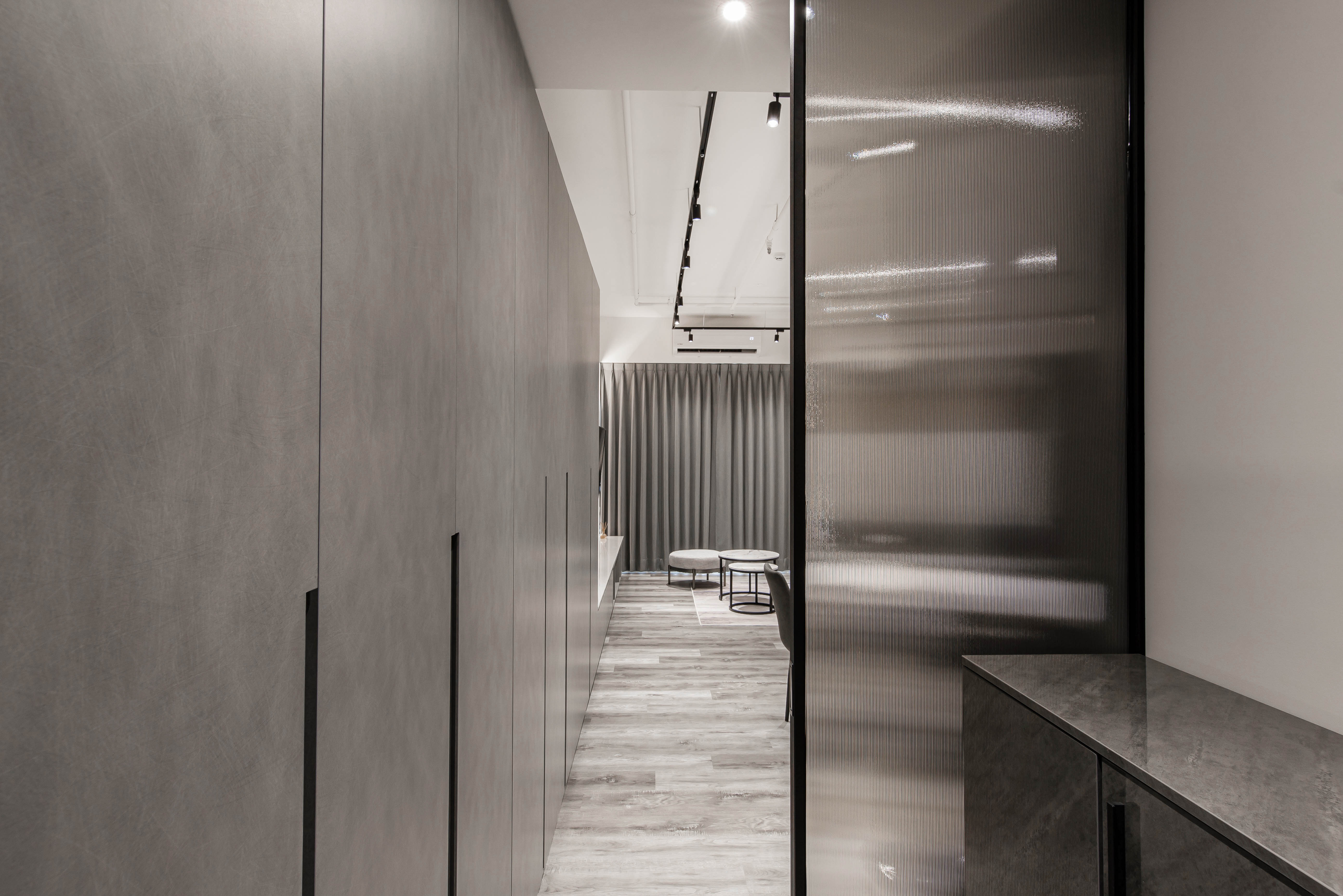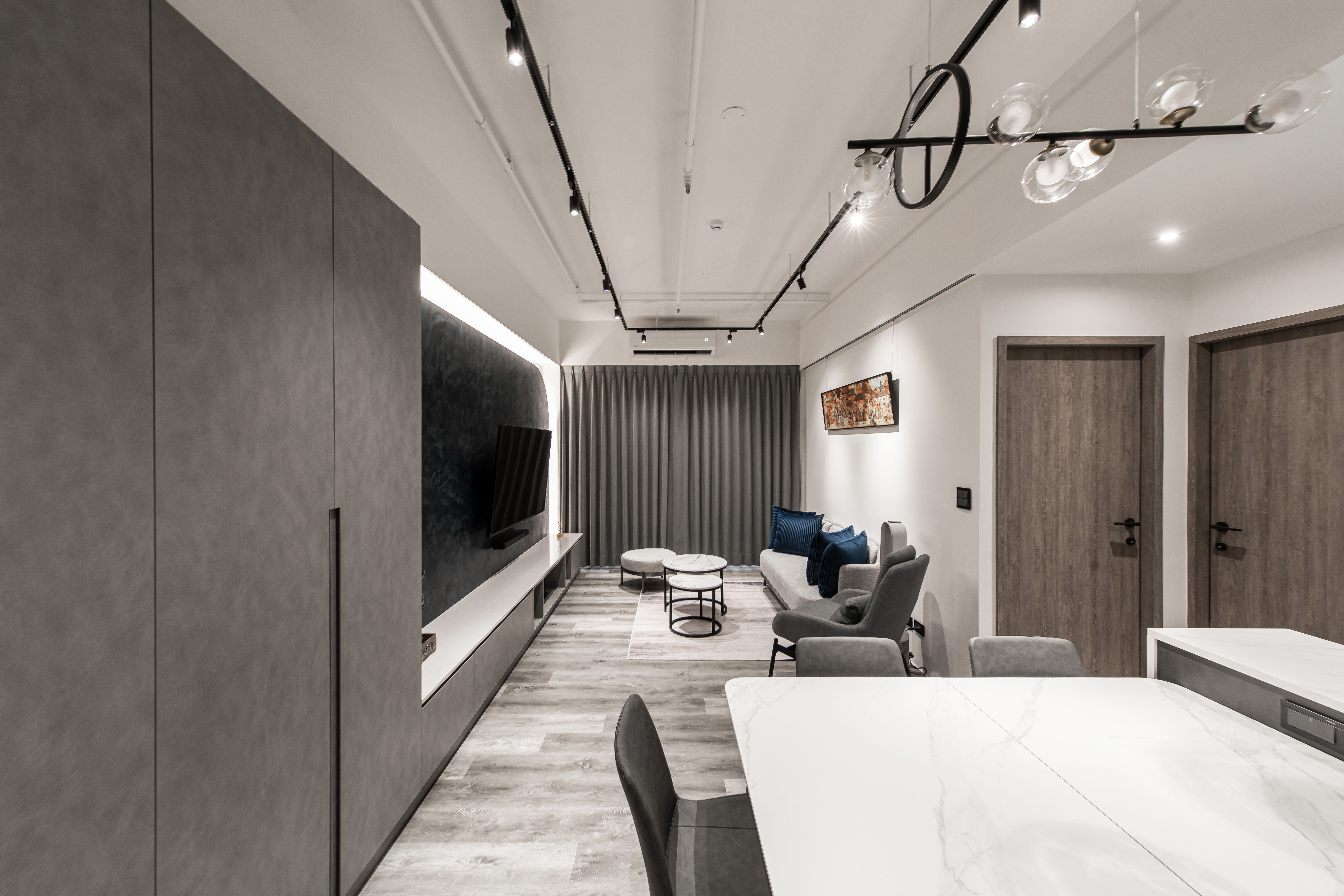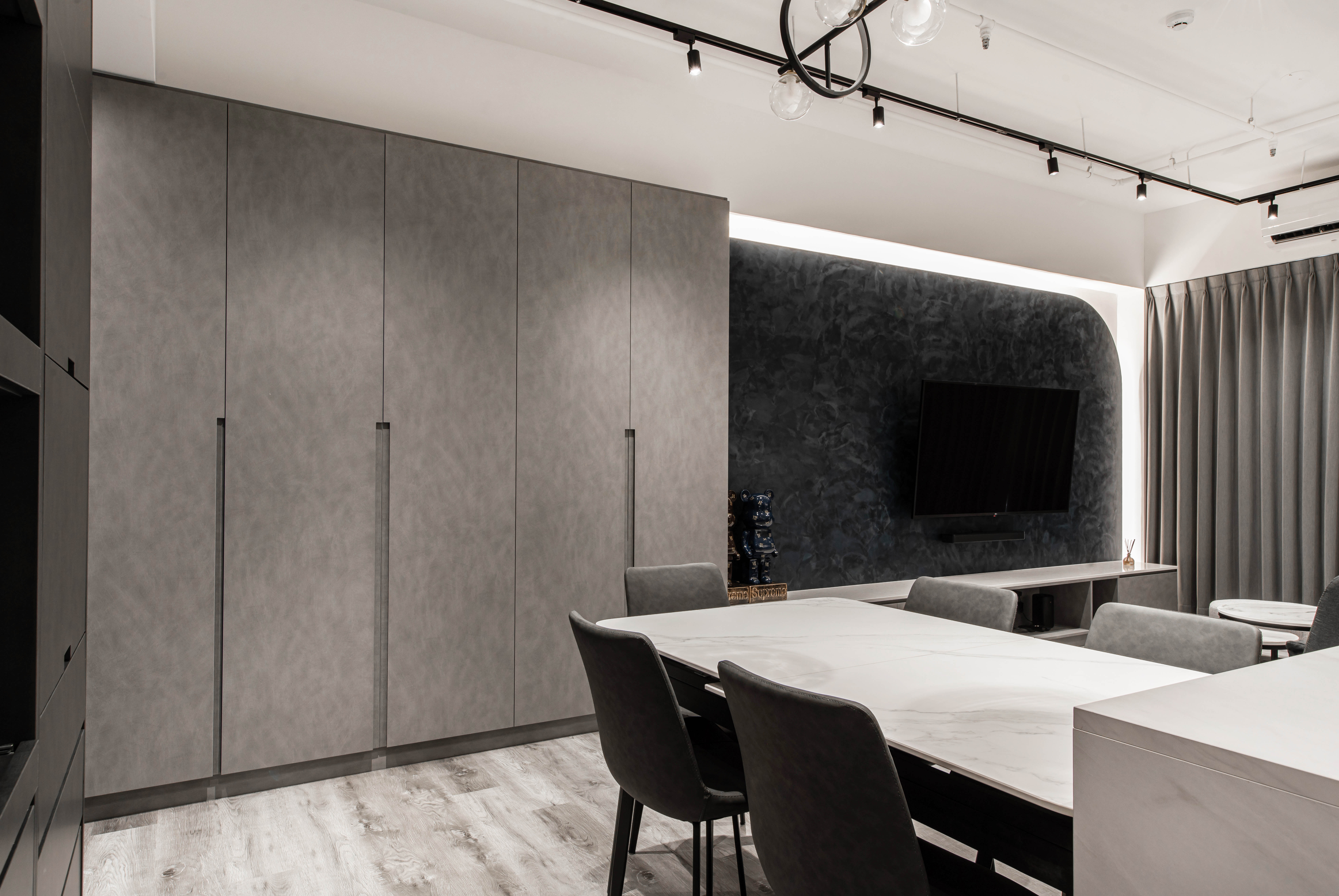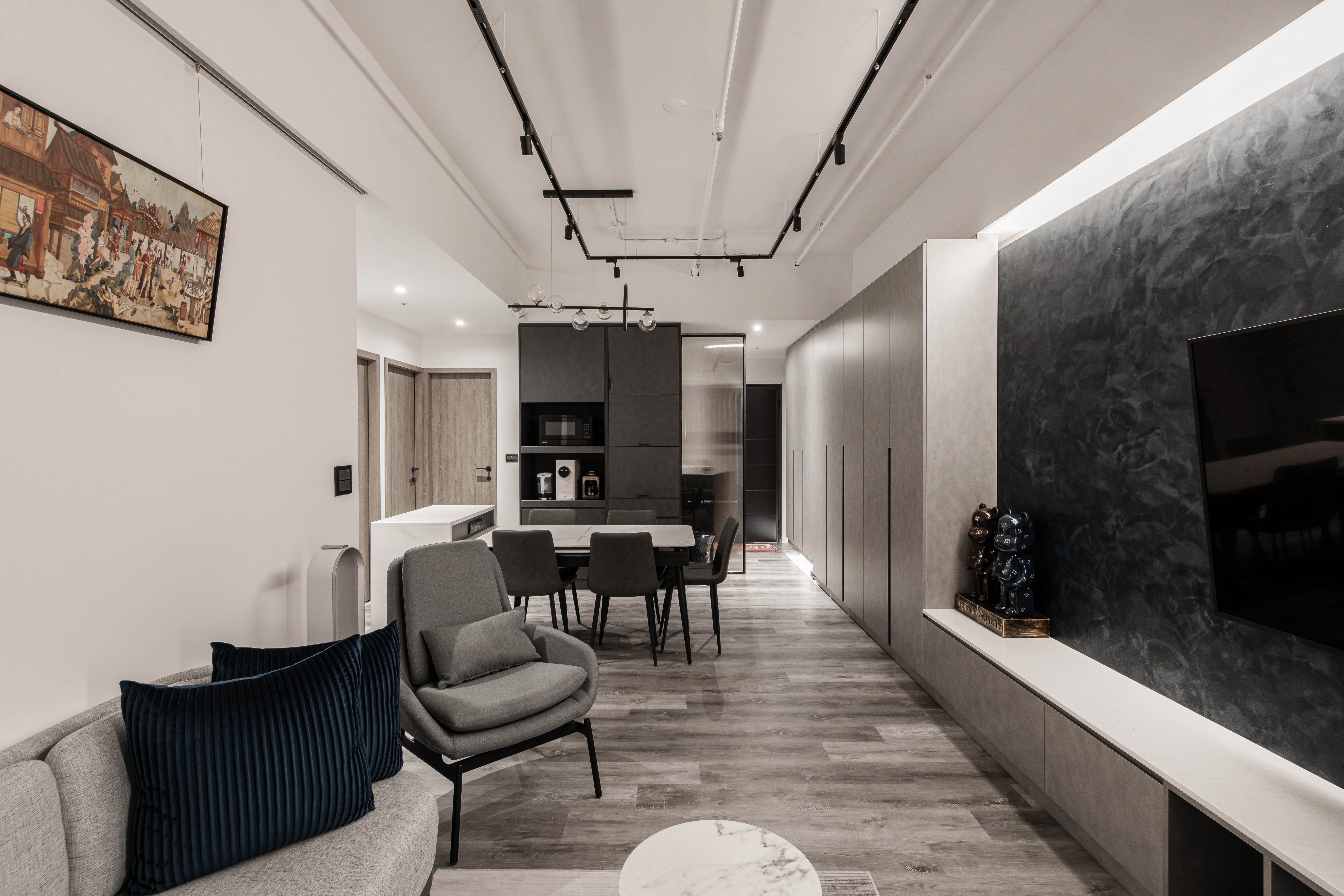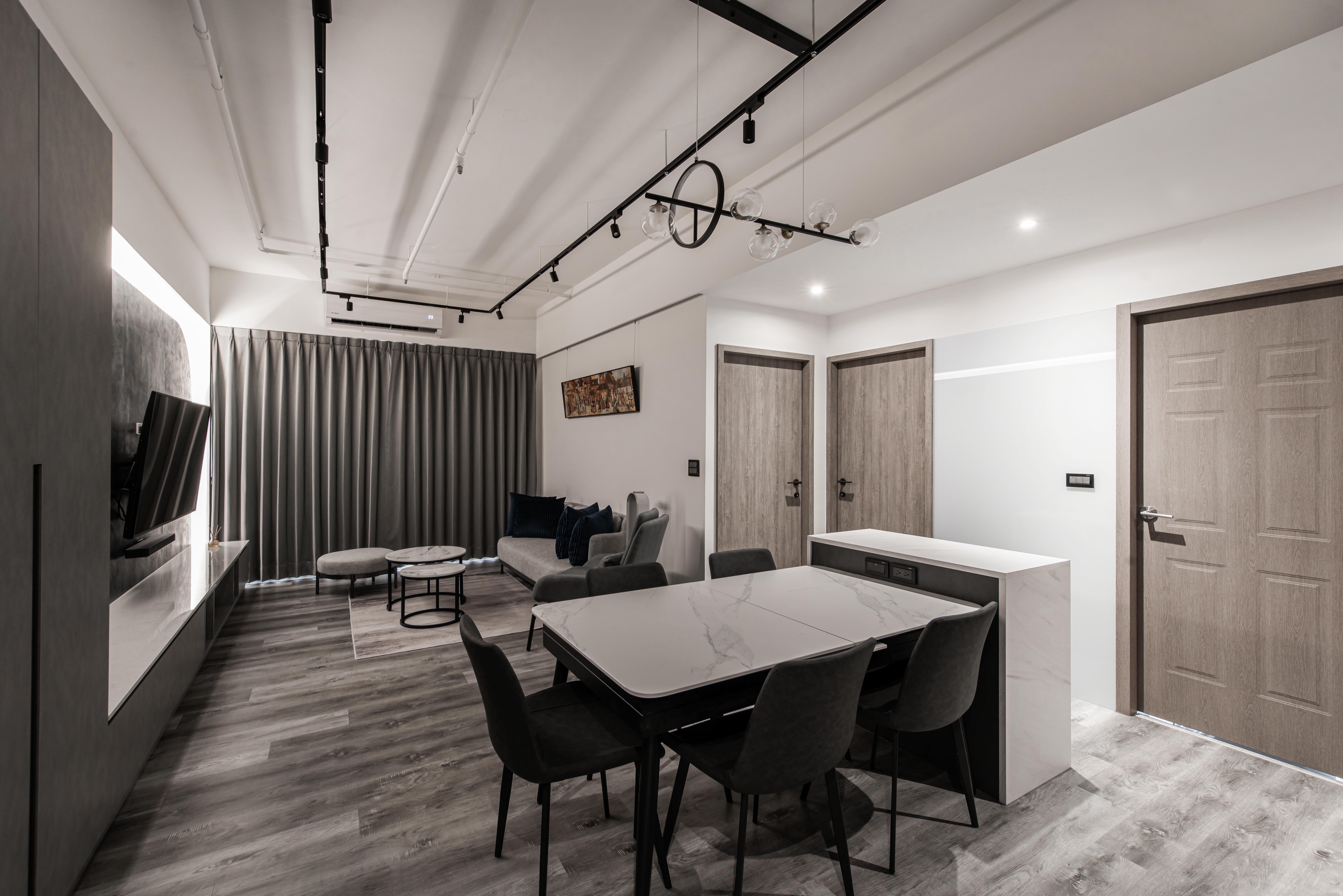 本案空間大量採用經典的灰與白鋪敘,透由家具、軟件添上不同色階黑、白、灰筆觸,營造中深遂、立體且延續的空間感。從玄關延伸至電視櫃的收納量體,在此以單一色調俐落面貌裡,讓櫃體延伸了空間的視覺體現,深刻為裝潢風格定調,量身訂製的美型櫃體設計,不僅不會產生壓迫感,也充分創造出日後生活雜物的收納空間,在業主入住後,更容易維持環境整潔。