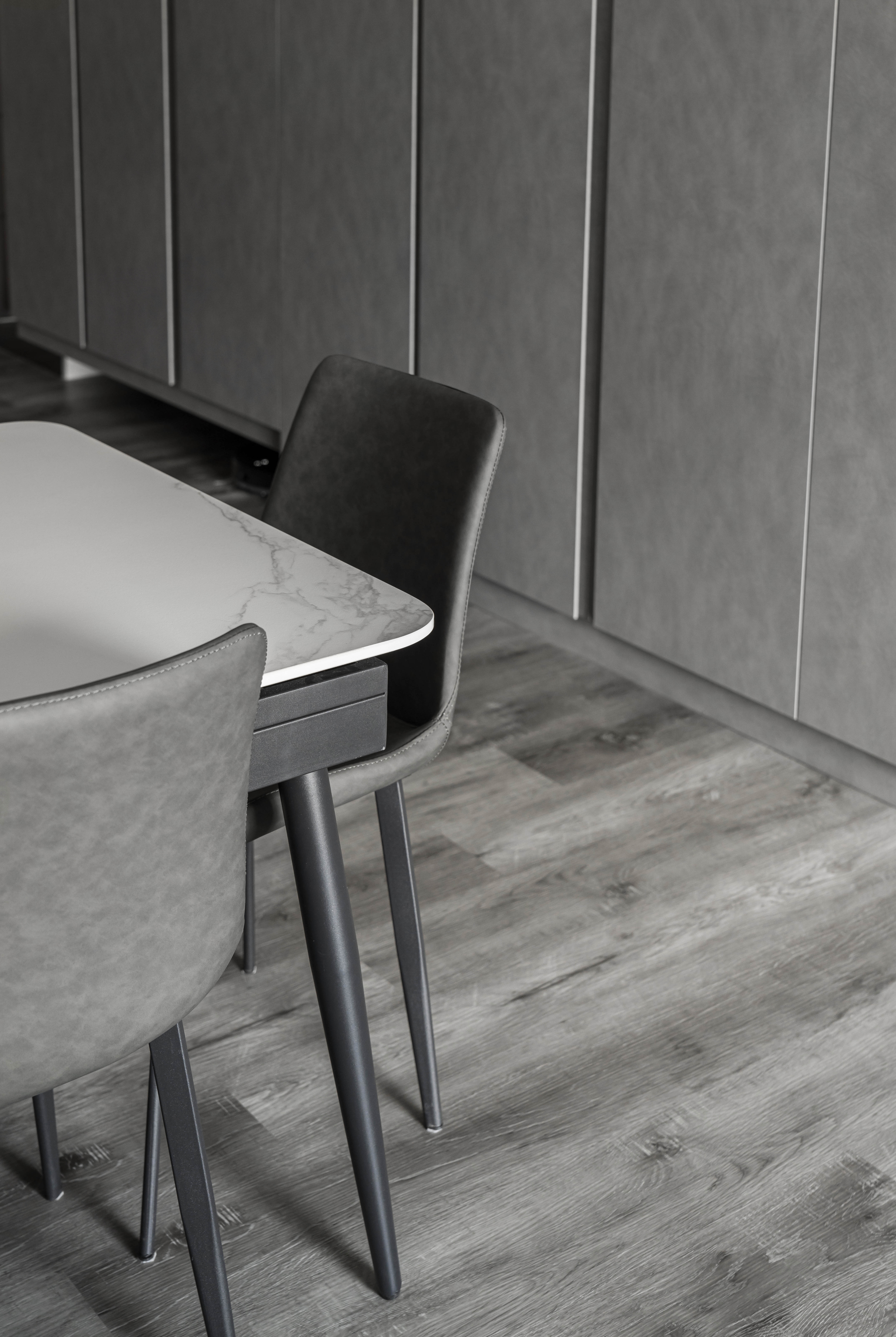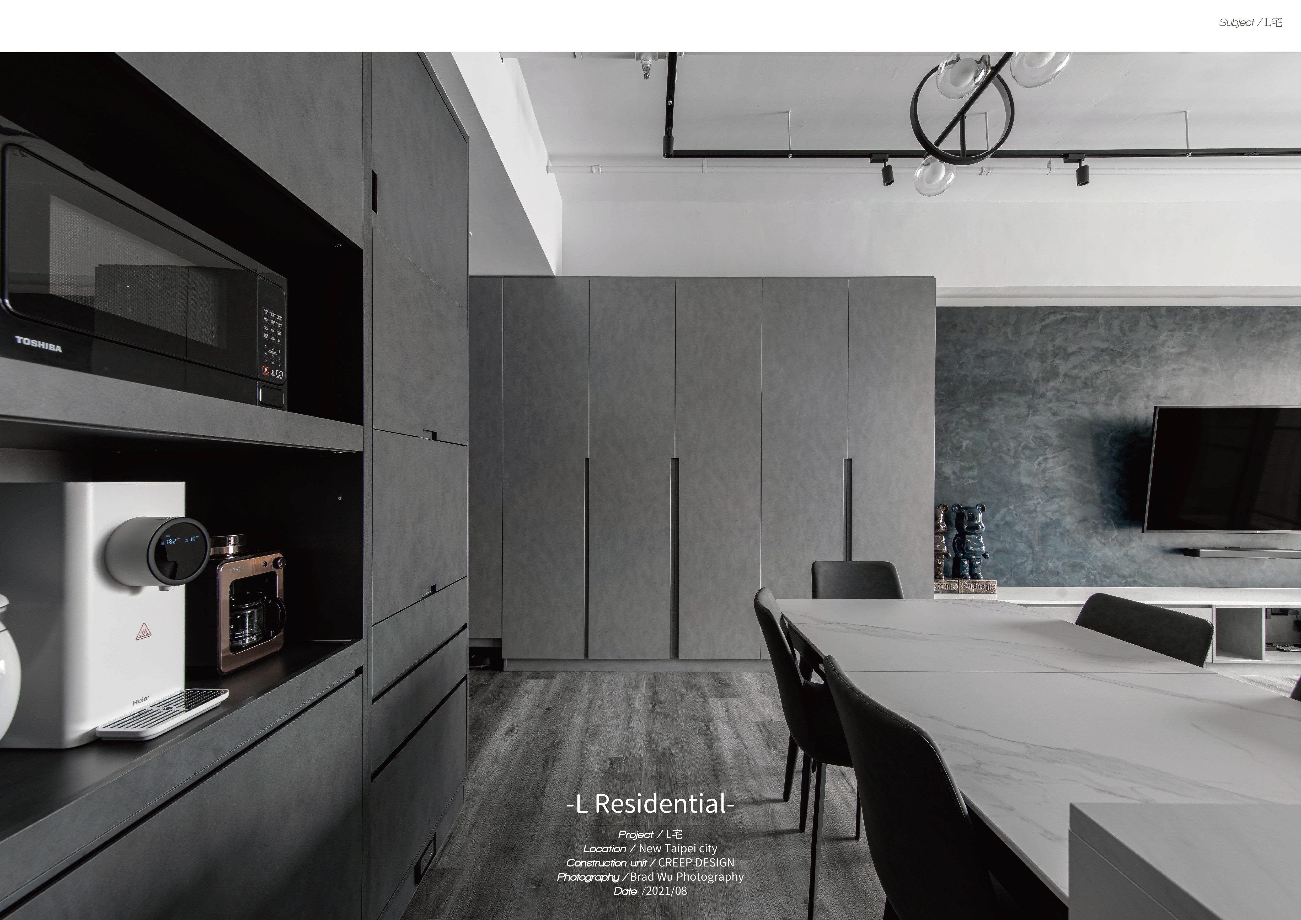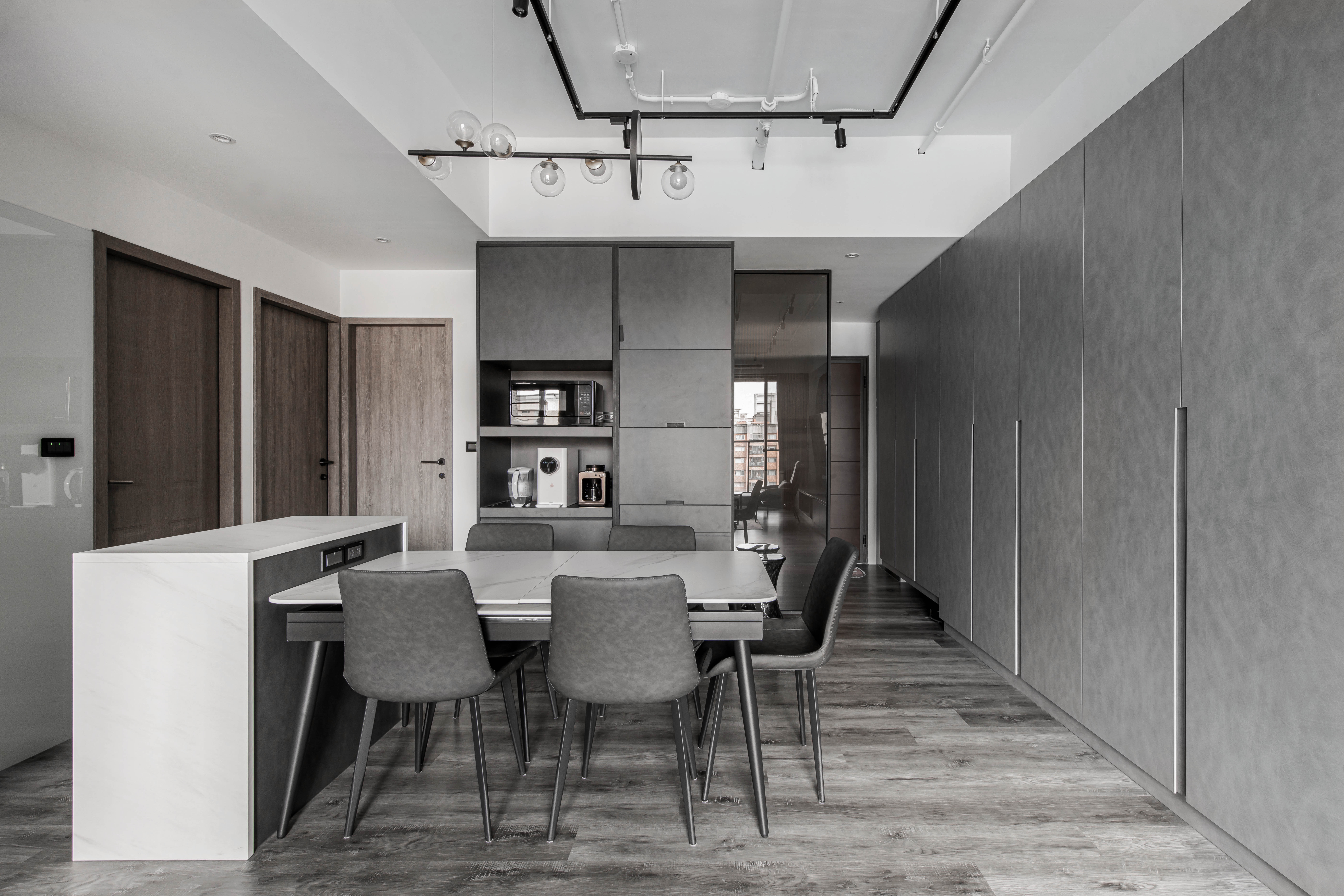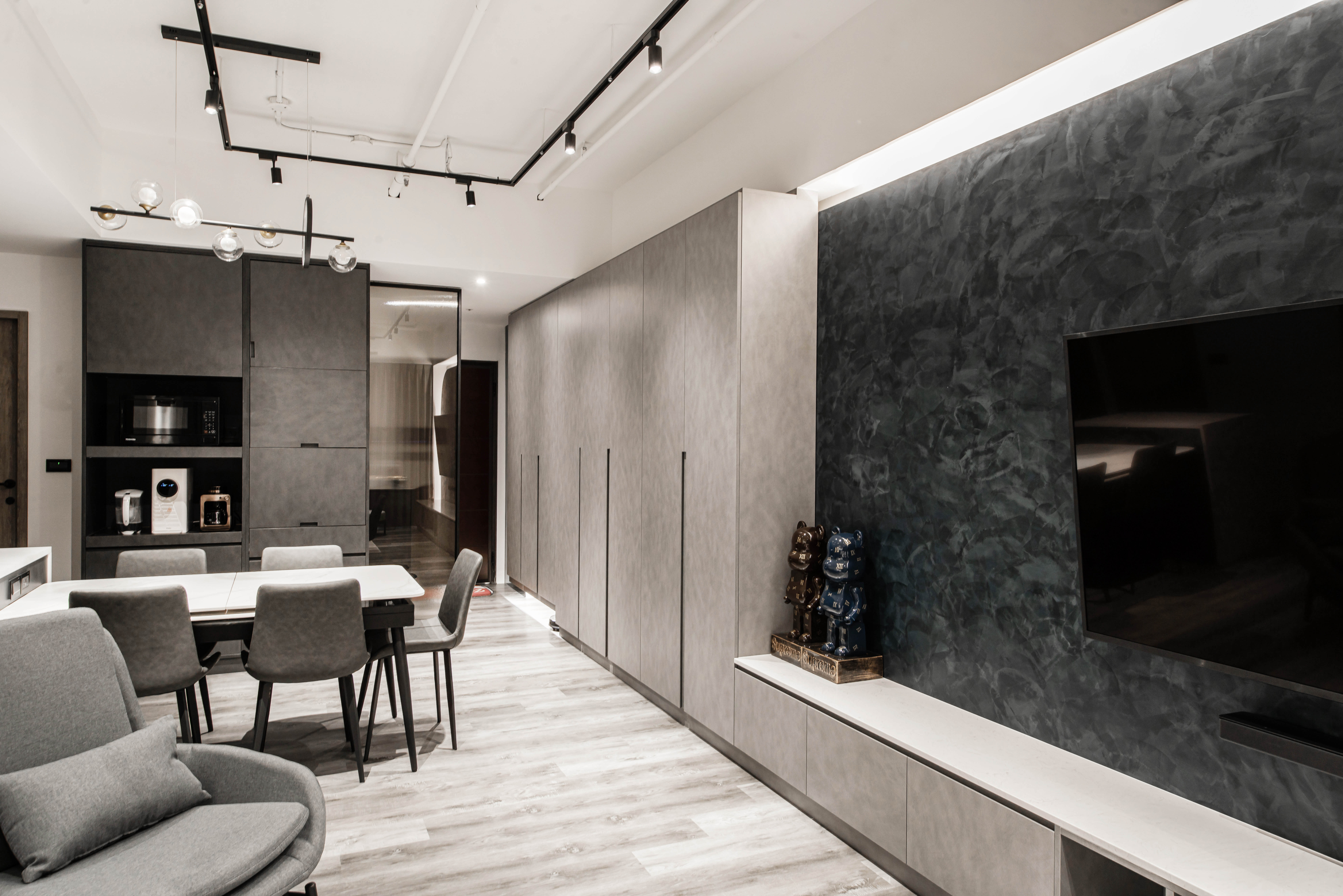 本案空間大量採用經典的灰與白鋪敘,透由家具、軟件添上不同色階黑、白、灰筆觸,營造中深遂、立體且延續的空間感。從玄關延伸至電視櫃的收納量體,在此以單一色調俐落面貌裡,讓櫃體延伸了空間的視覺體現,深刻為裝潢風格定調,量身訂製的美型櫃體設計,不僅不會產生壓迫感,也充分創造出日後生活雜物的收納空間,在業主入住後,更容易維持環境整潔。