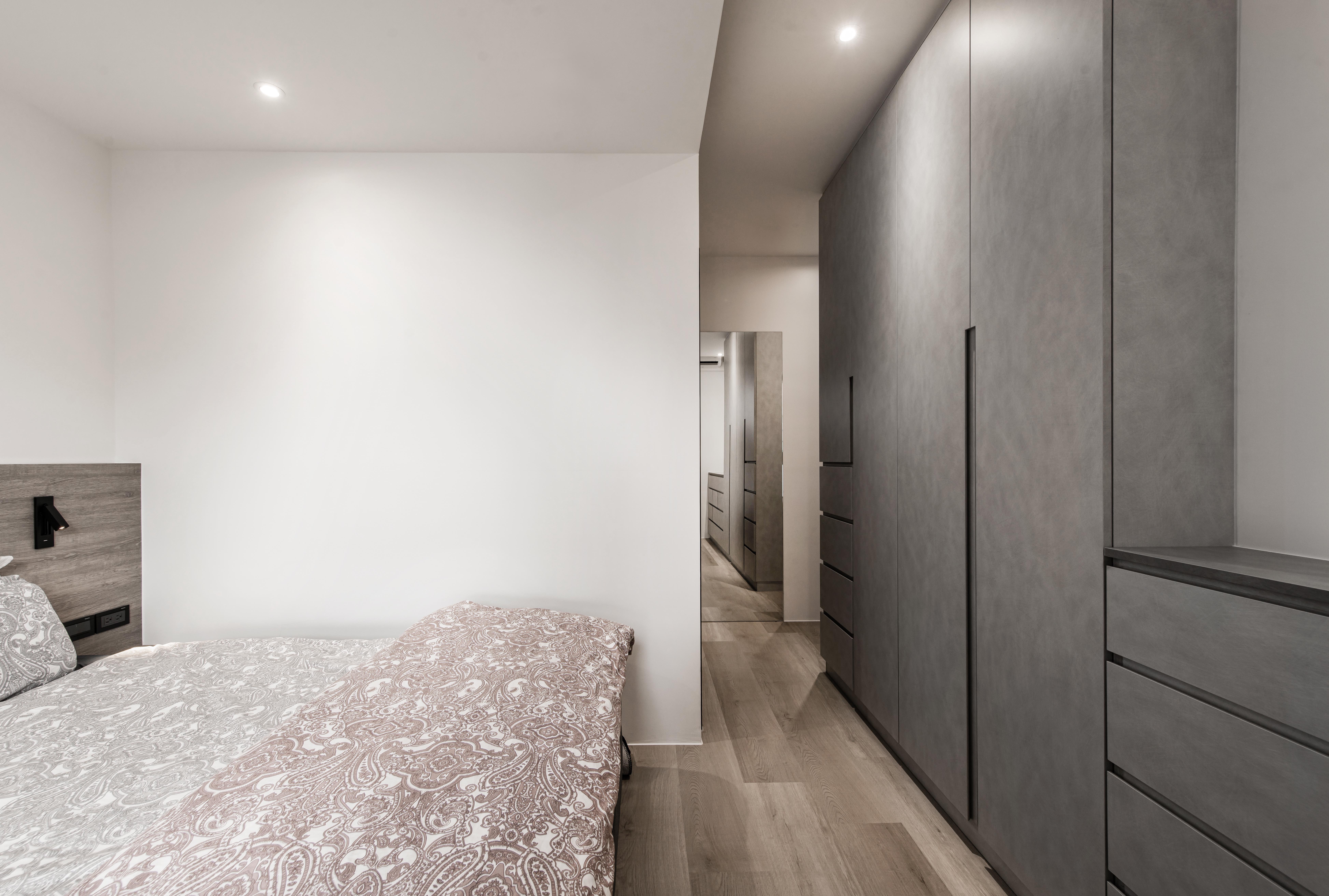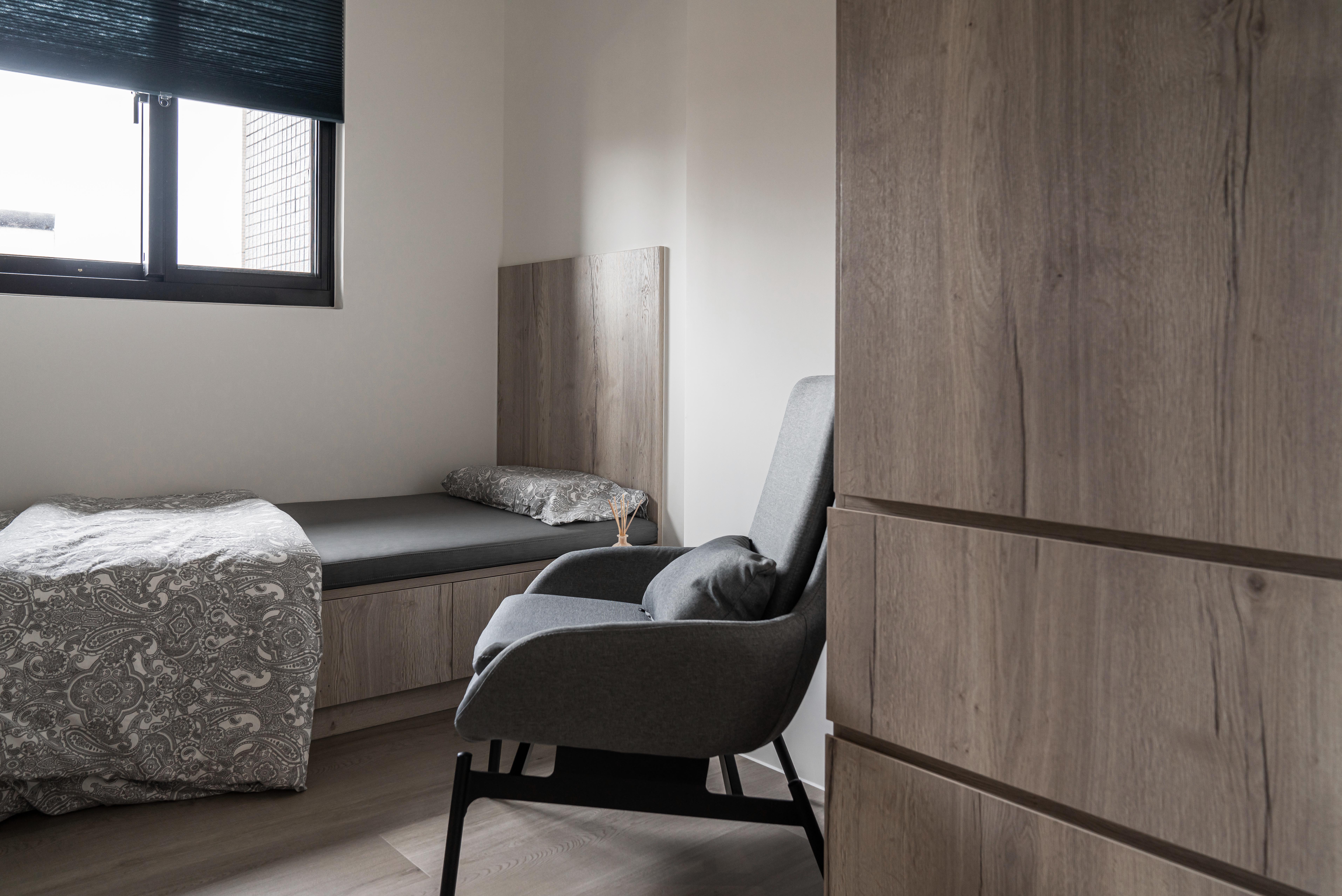 臥室的風格延續公共空間的設計,將相似元素重複利用,讓整體空間更加耐看且具一致性。並且在有限的空間內強化收納的完整性,沿著牆邊作櫃體,不僅讓環境輕盈也是空間動線性更為流暢、舒適。