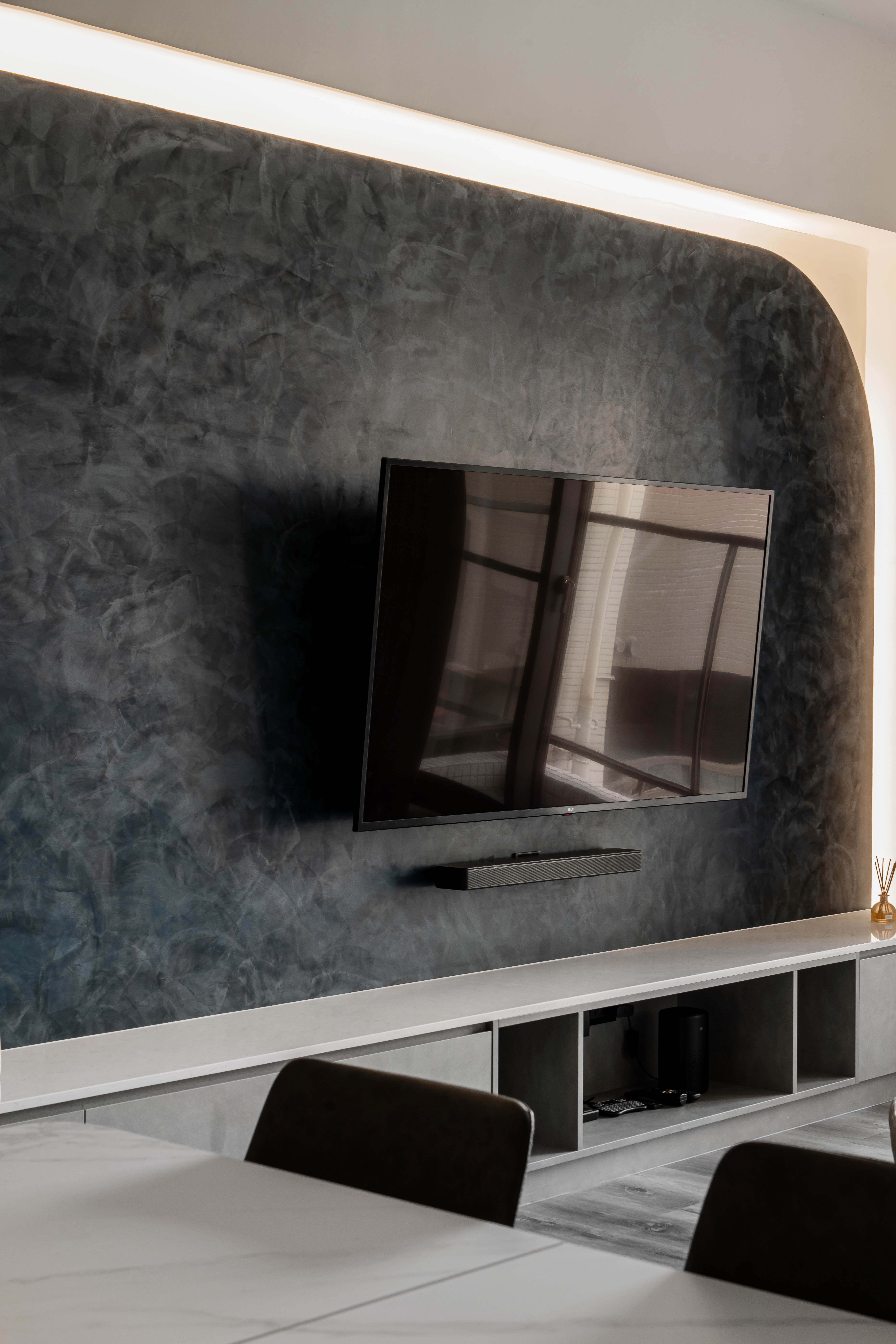 其中本案客廳還有一處畫龍點睛之處為不對稱造型電視牆,圓弧細節,修飾掉突兀的邊角,並將厚重的色調化為輕盈的牆面線條,描繪視覺上的一抹柔美。