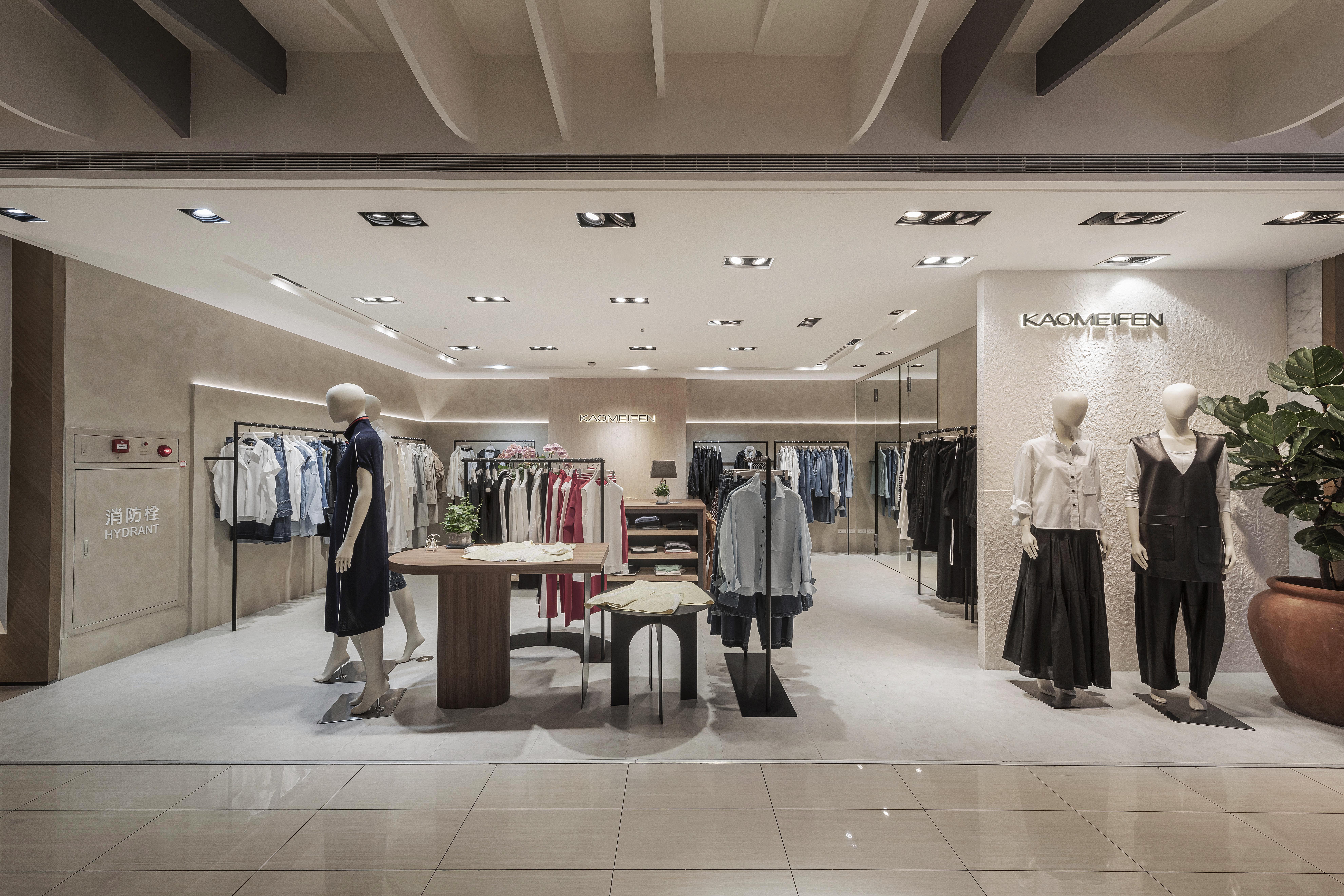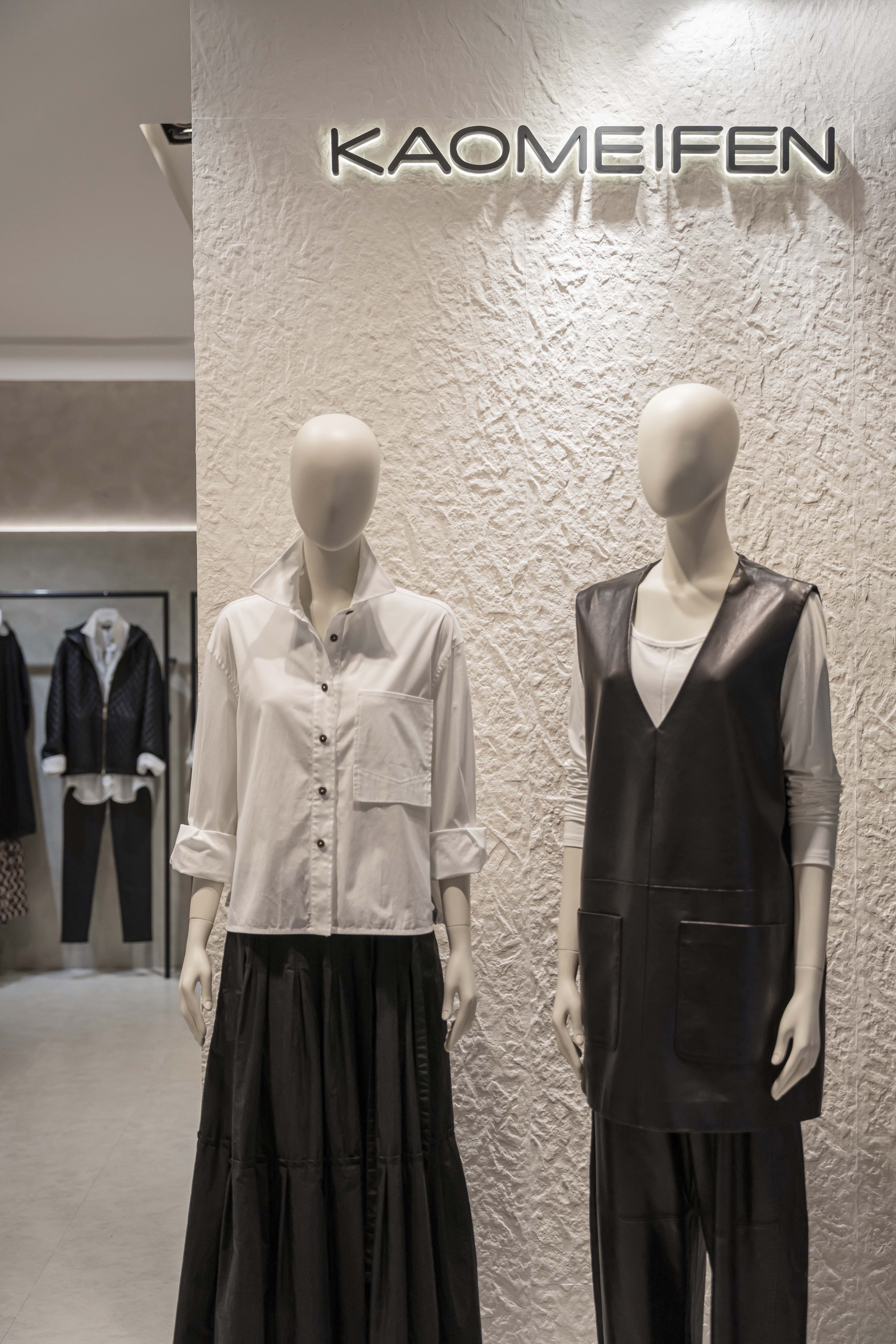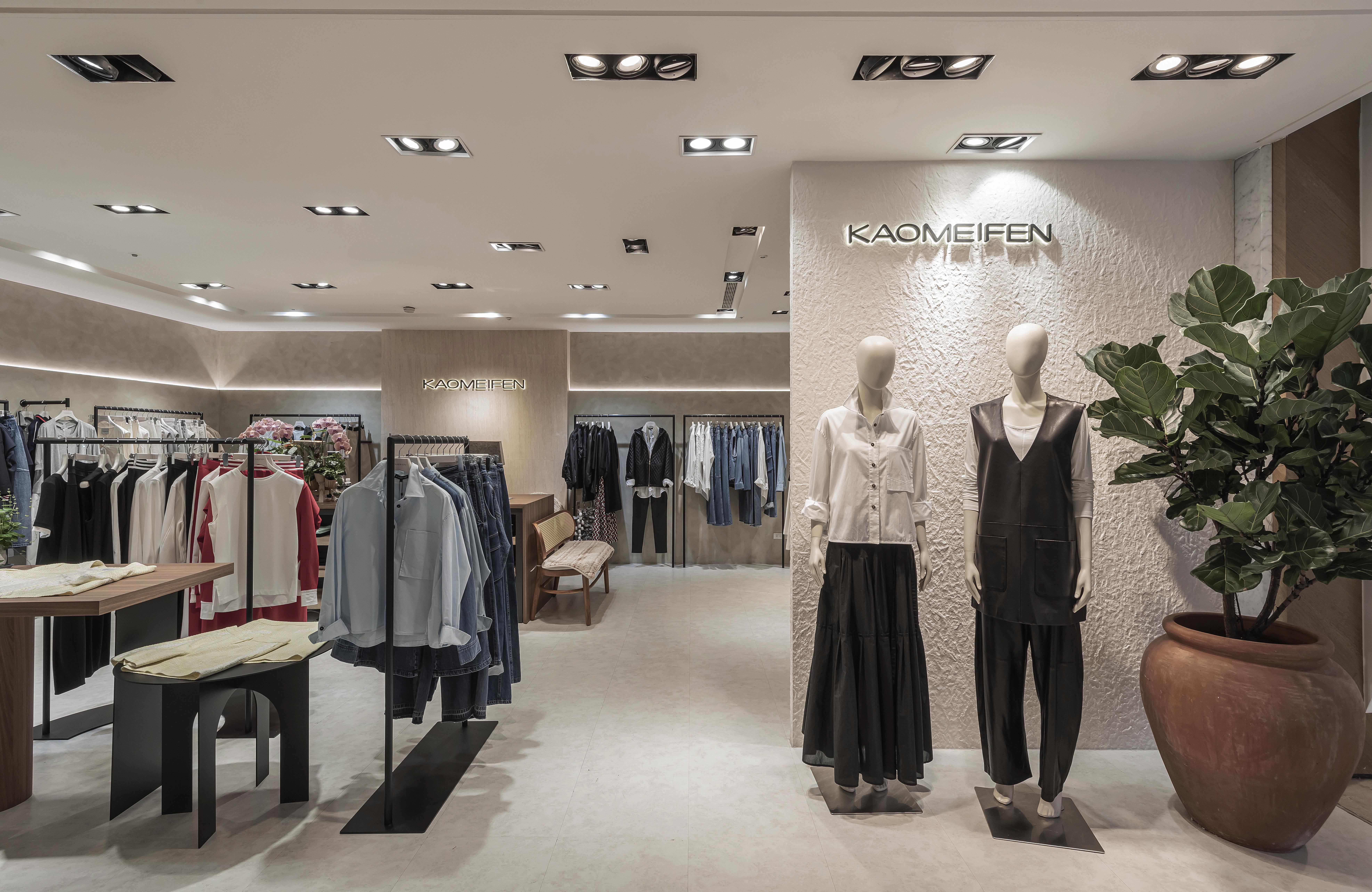 位於百貨商場中的 KAOMEIFEN 服飾櫃位,透過溫潤色調、細膩材質