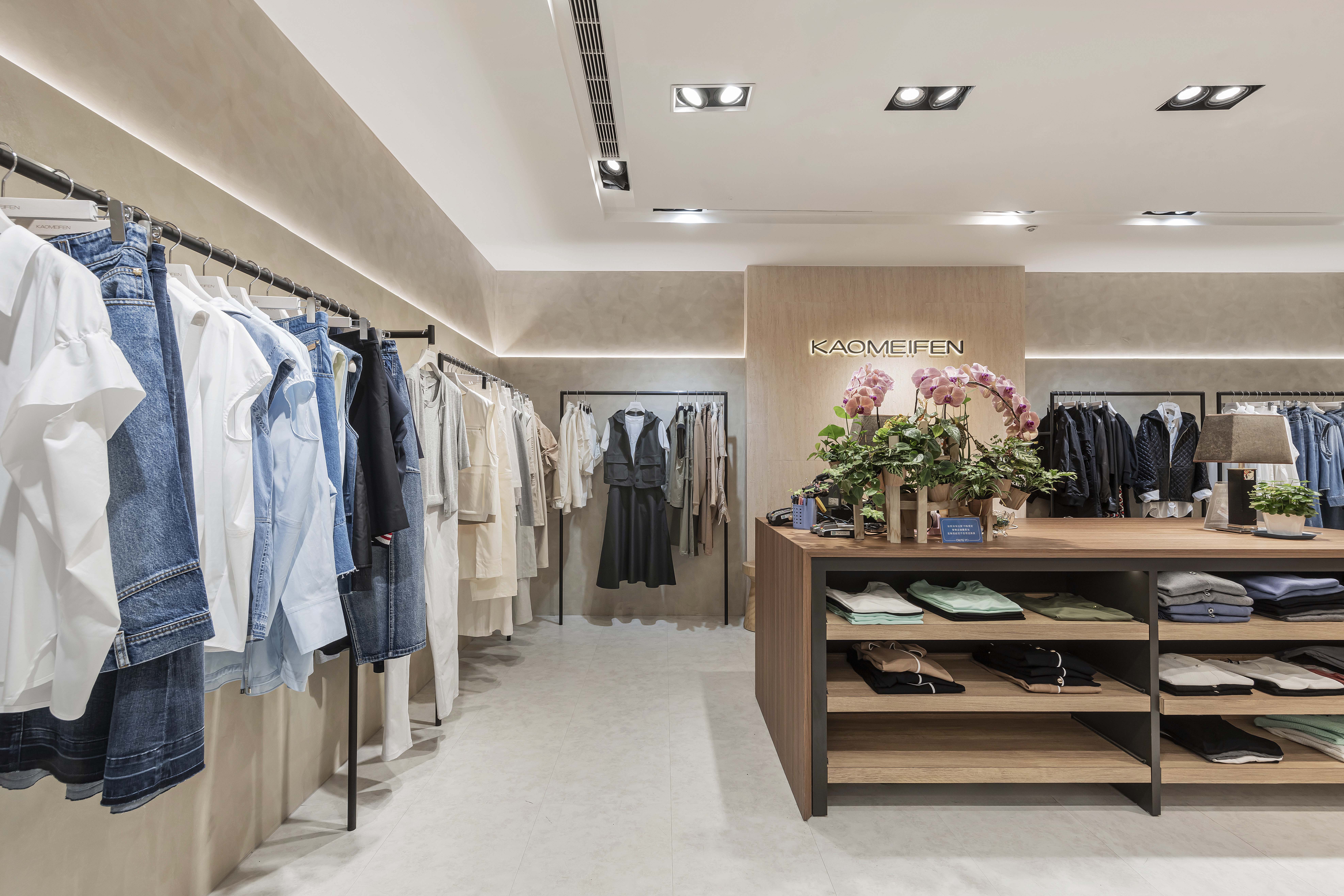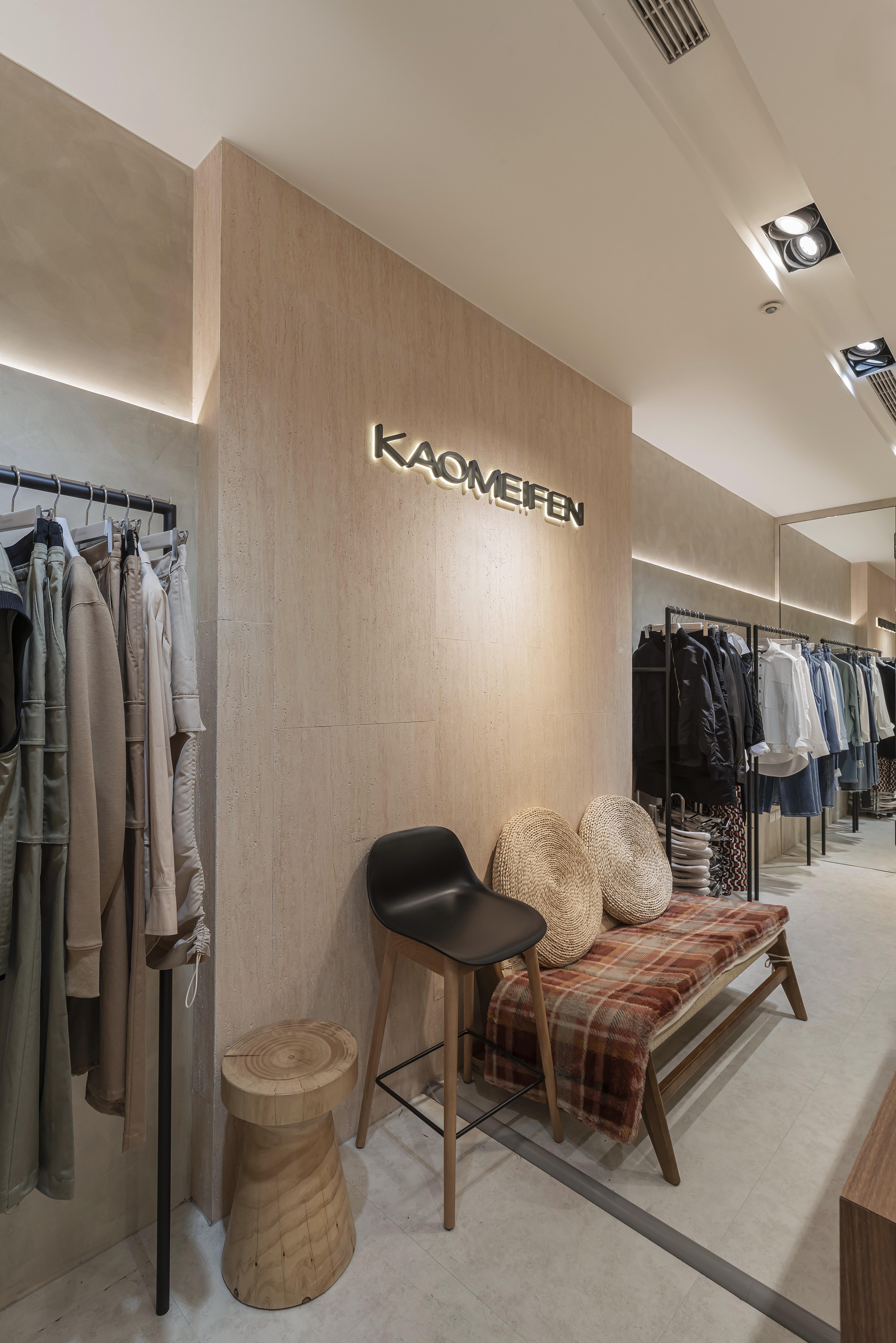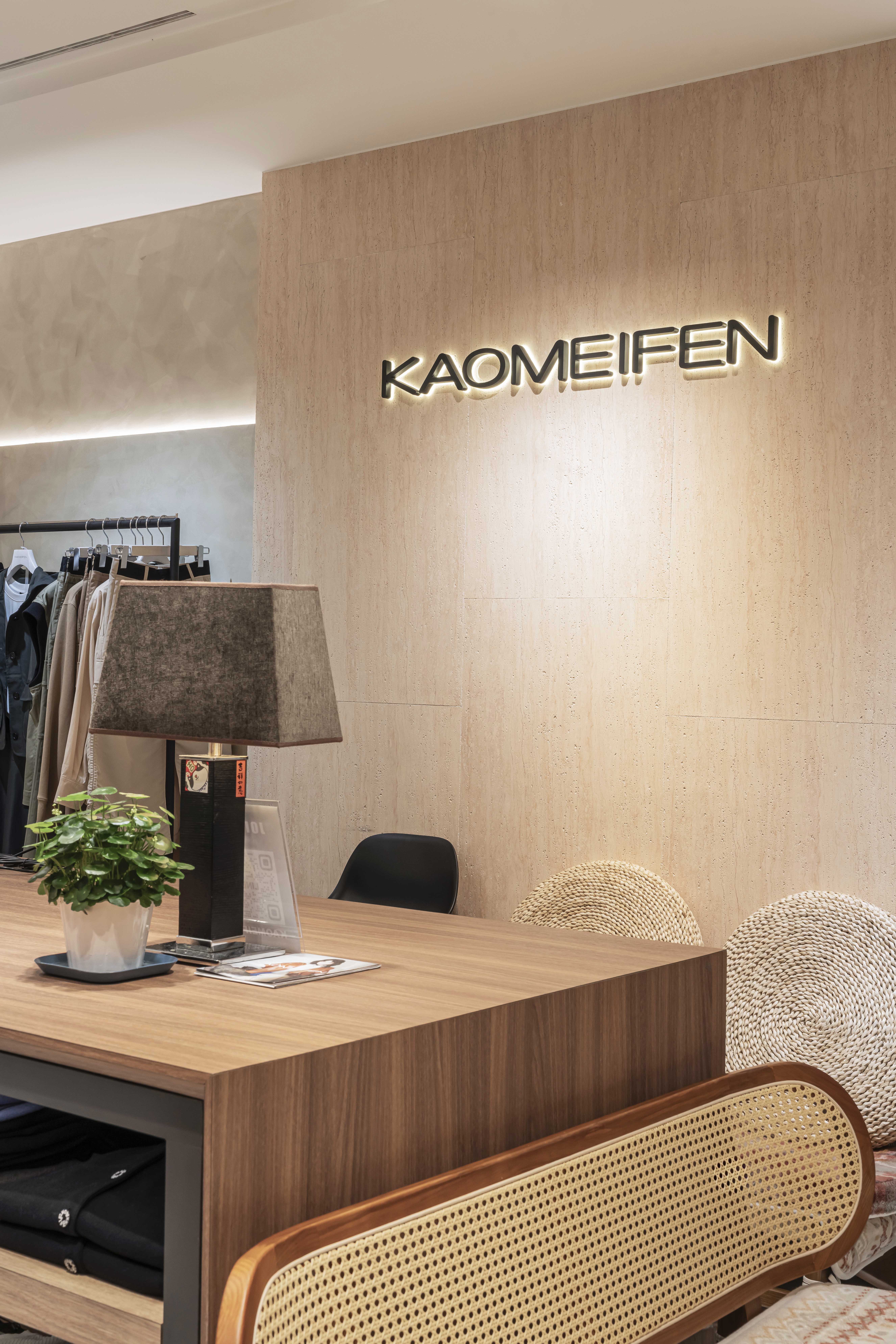 位於百貨商場中的 KAOMEIFEN 服飾櫃位,透過溫潤色調、細膩材質