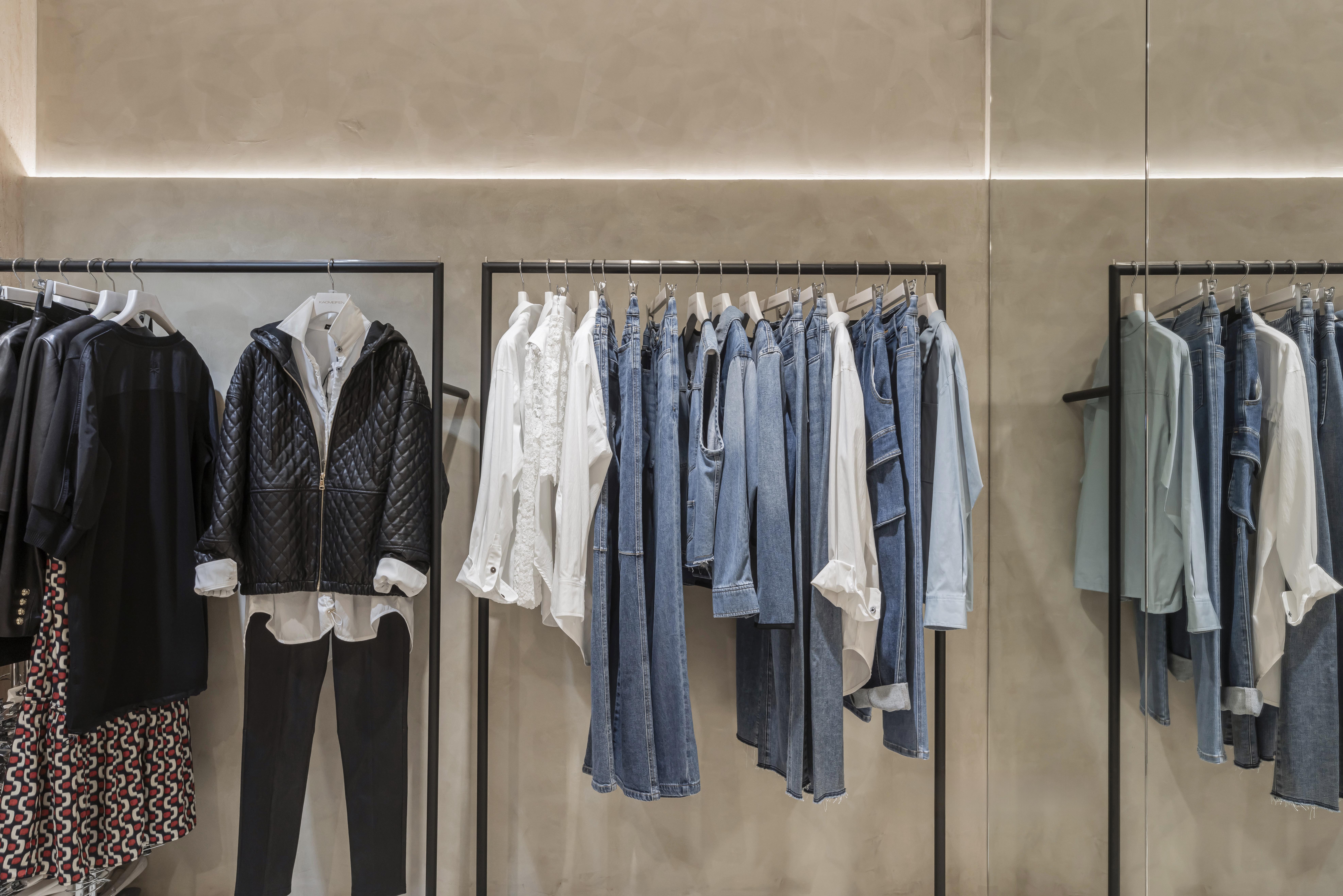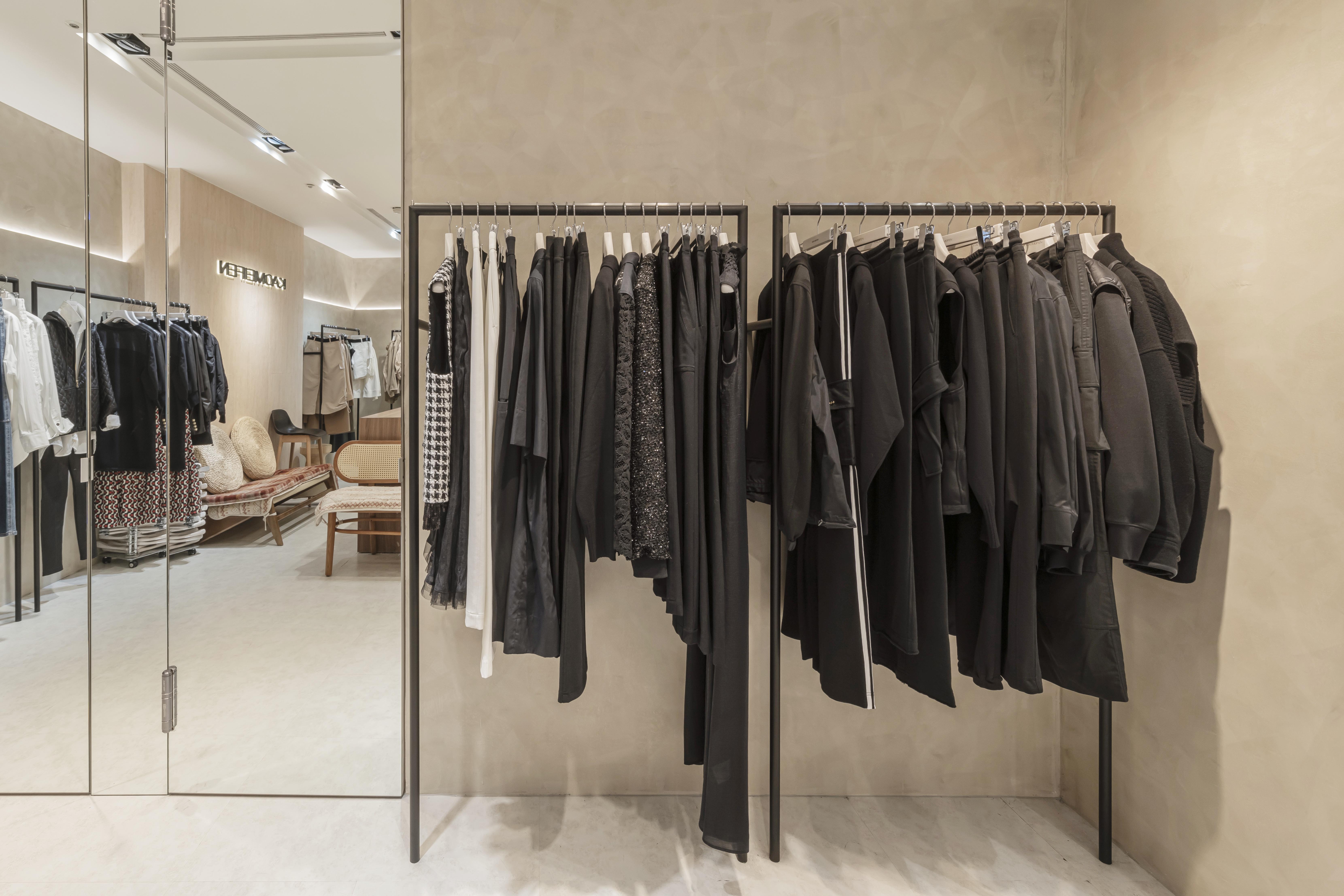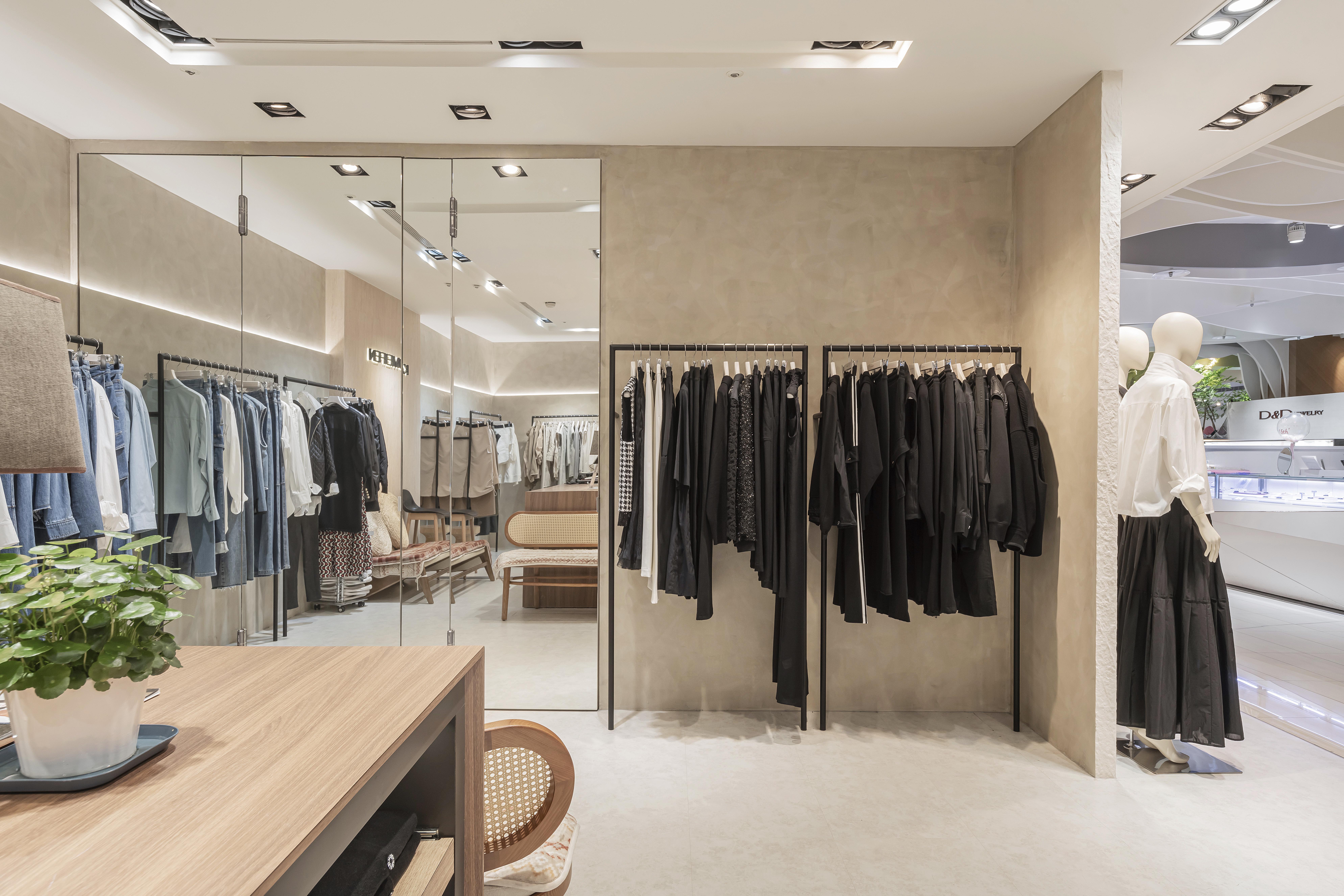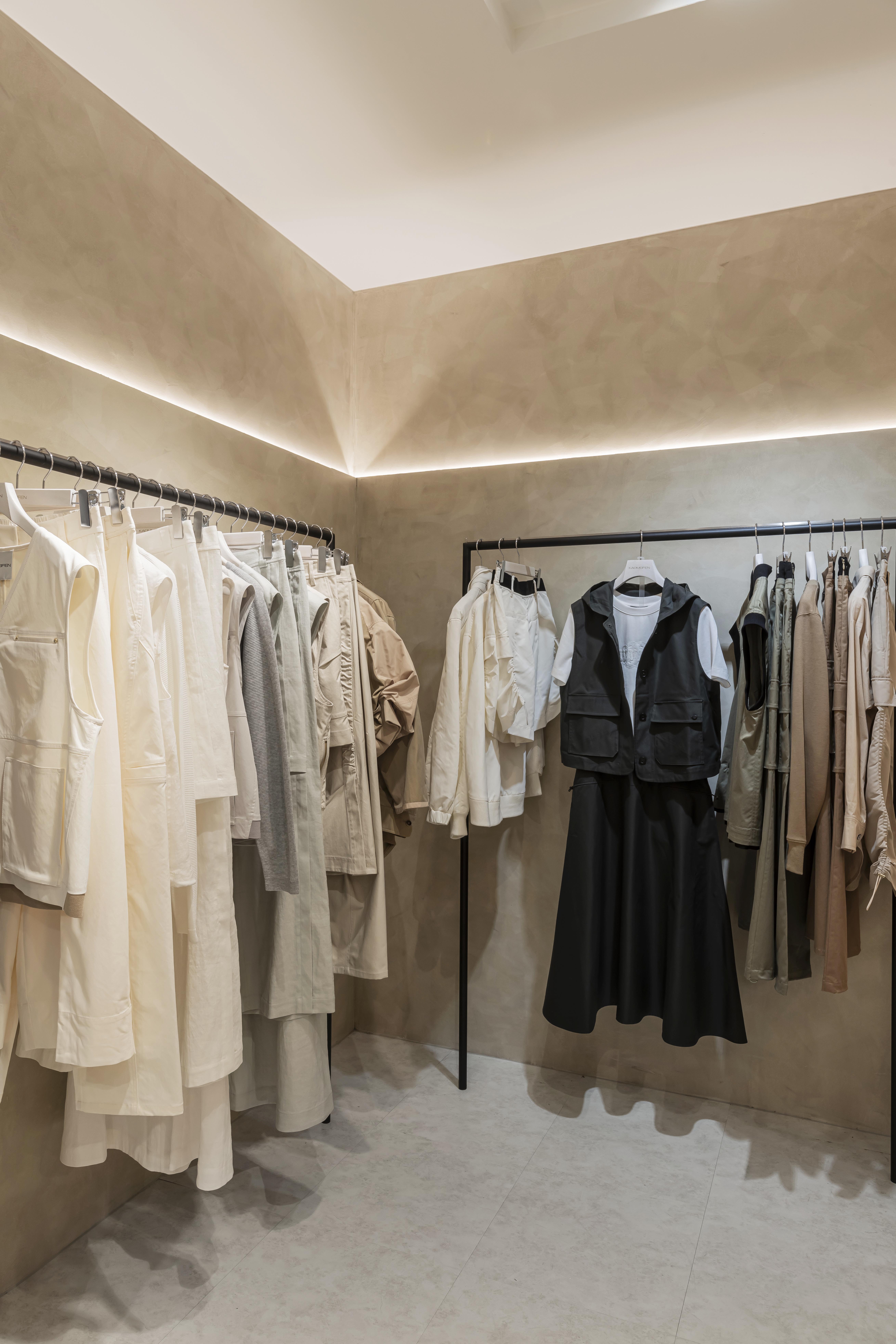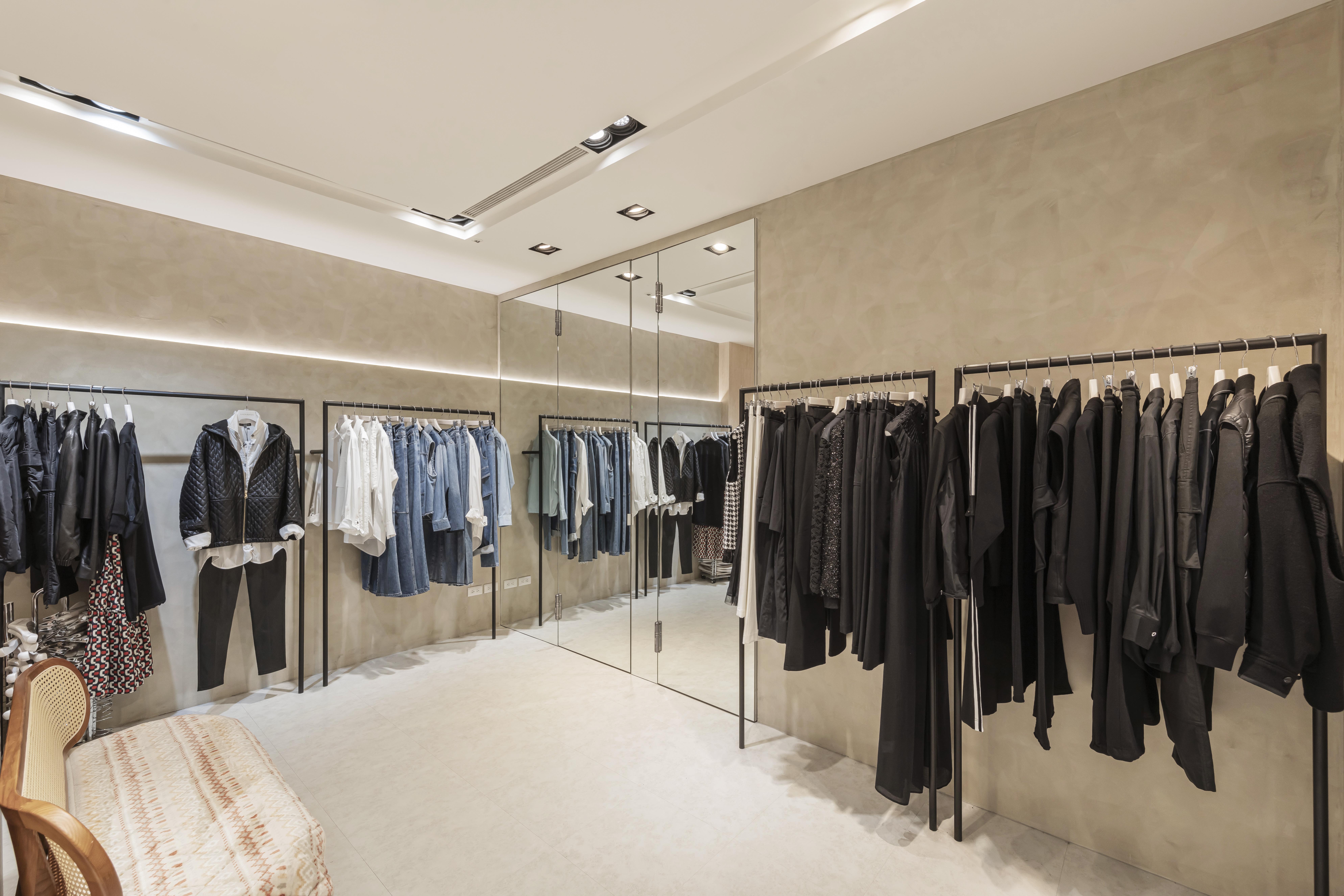 懸吊式吊架讓服飾如藝廊展品般錯落排列,色系與材質依序展開,使